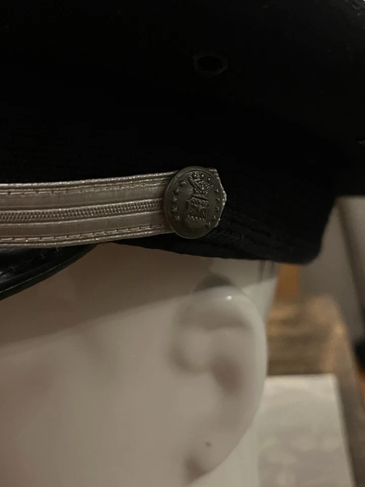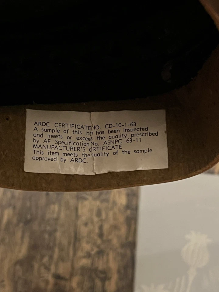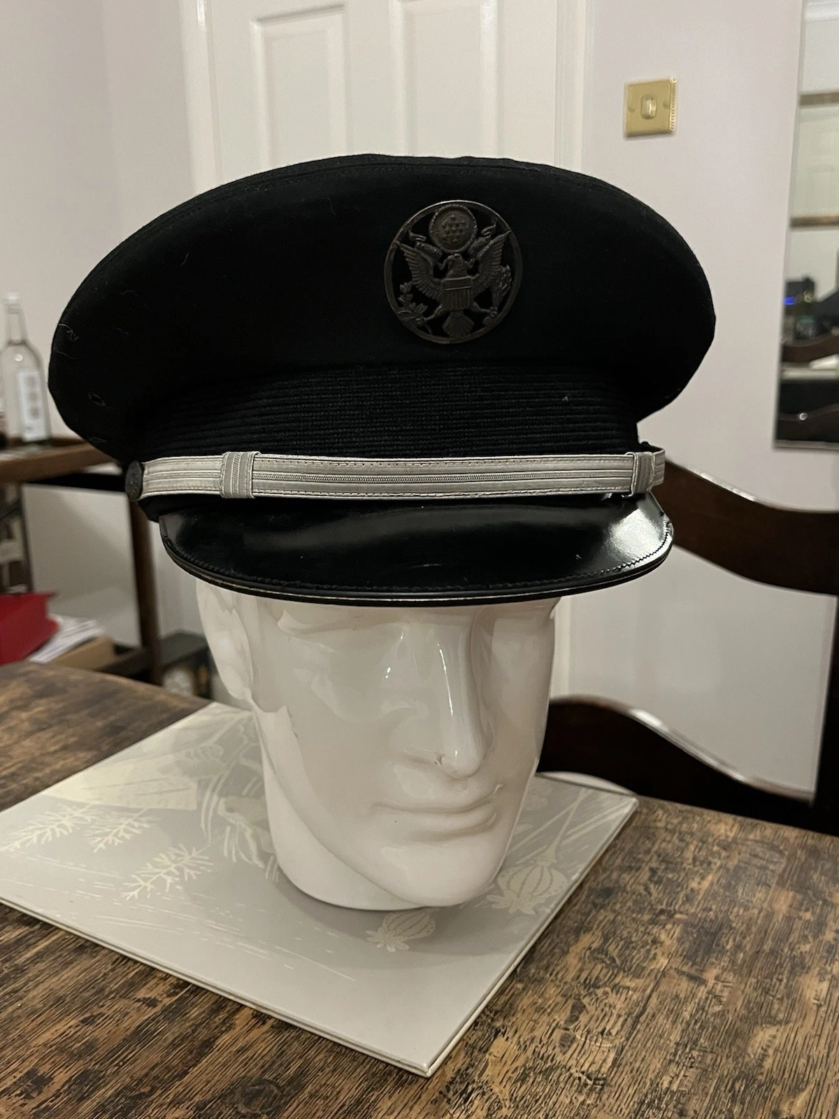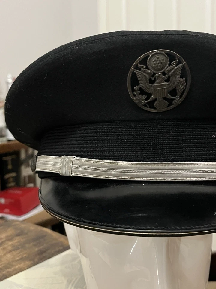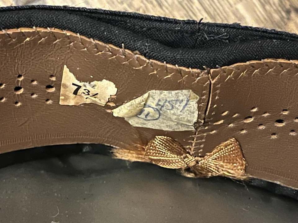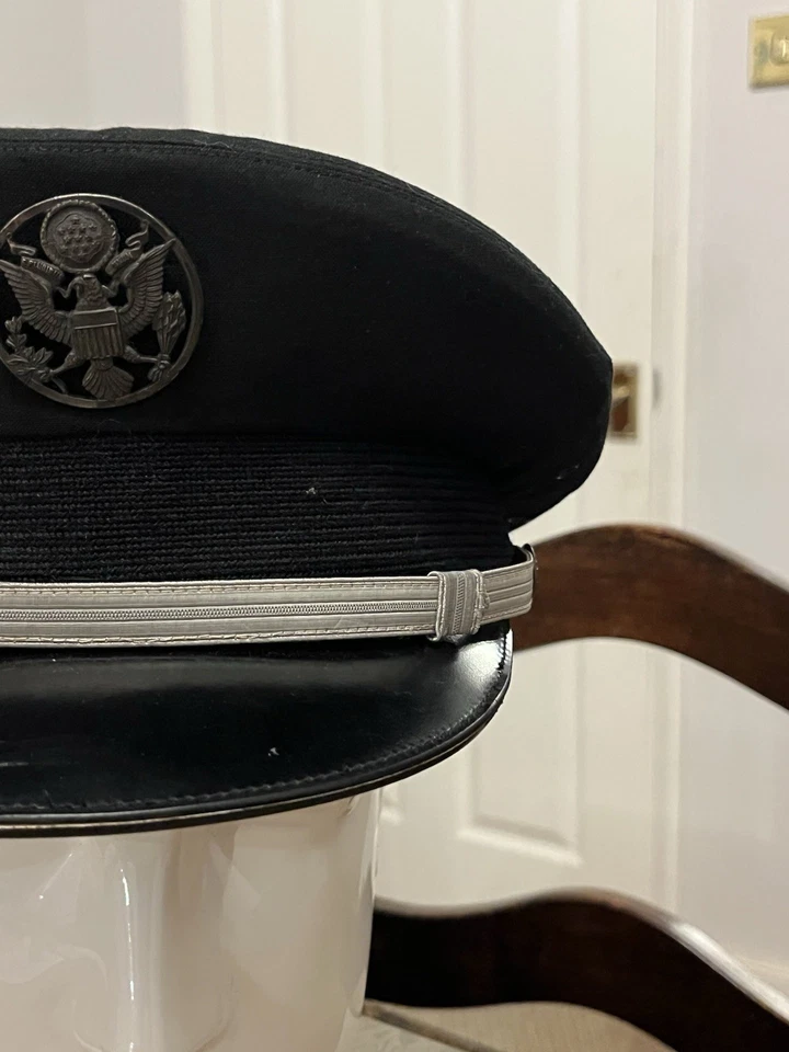 This is an original 1960s Vietnam Era US Air Force Peaked Cap/Hat. This example is in very good condition for its age with there only being a few signs of wear. It has no moth and has all of its original features. It has what we’re believe to be a silver cap badge complete with its original backing and 2 buttons on each side of the chinstrap. It has its original size tag and US Air Force acceptance stamp on the inside as shown. It is in a large size Size 7 3/4 or 62cm. It has not had any other names written inside and the original tag for the company who made it is also still inside. This example came from an old movie prop company but we are unsure what films it was used it. Please see photos for condition.