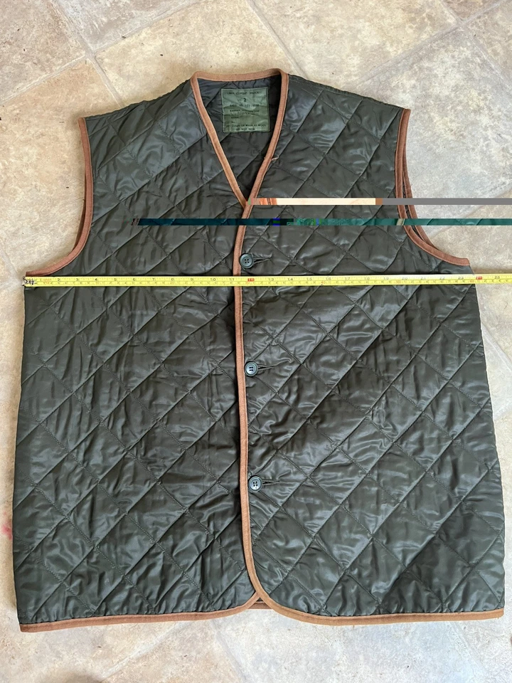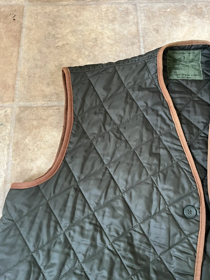 Liner Combat Smock 1968 Pattern Size 2 CT2a 1980 Falklands War Era Cold WeatherExcellent Falklands era Liner Combat Smock 1968 Pattern Size 2 early CT2a contract number equating to 1980. designed to be used during Cold Weather below the 1968 pattern combat smock and allowing full use of the armsSingle-breasted quilted jerkin style body warmer of olive drab nylon. Fastened by three plastic buttons to the front, the liner is collarless and without sleeves.LabelWorn over the shirt and 'Wooly Pully' jumper, in cold weather the liner was worn as an additional layer of clothing beneath the combat smock in the 1970s, early 1980s. Much like the previous leather jerkin, soldiers often wore the liner as a top garment when driving vehicles, cleaning weapons, or when digging trenches, depending on the tactical situation.This example is in very good condition all round with no holes or stains. It is in a good size and will fit up to a size 46” chest. Please see photos for condition.