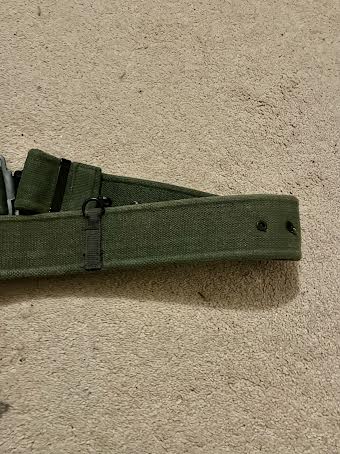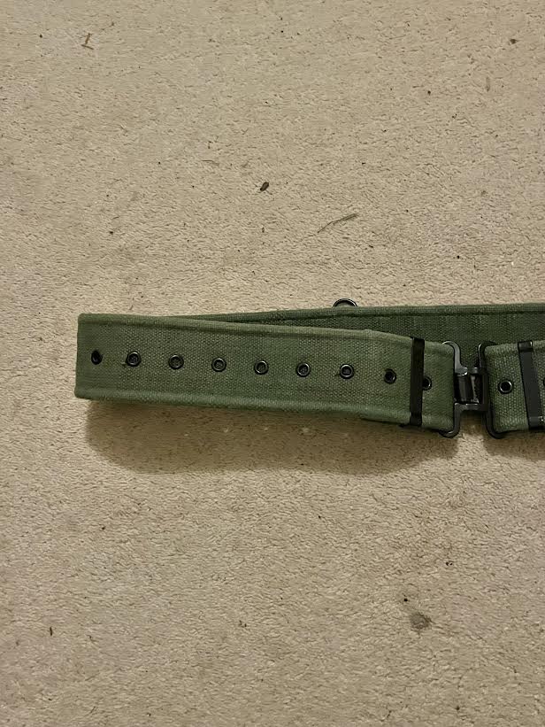 This is an original British Army 58 Pattern Webbing Belt. This example is in good condition with some-wear and tear from military use. This belt has all it’s fittings The green paint is in perfect condition with almost no damage or wear at all. This example is in great condition and has no date or markings on the inside. This example is adjustable and will fit up to a size 44” Waist. Please see photos for condition.
