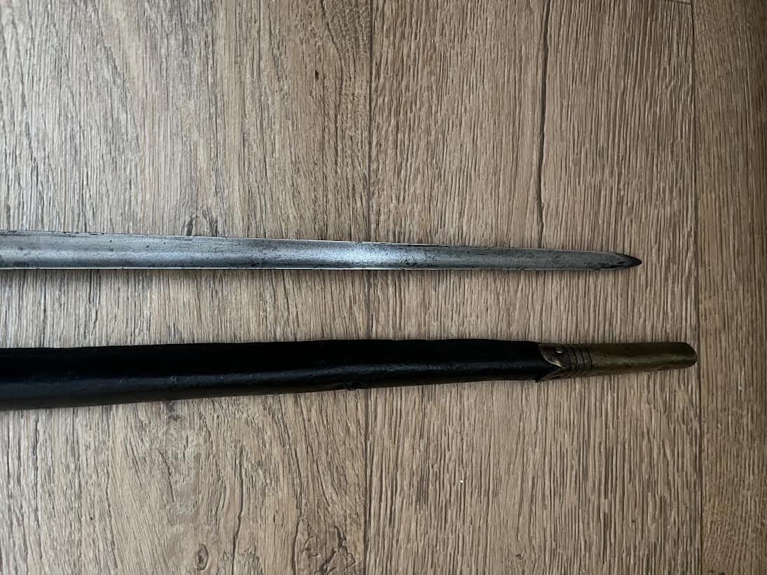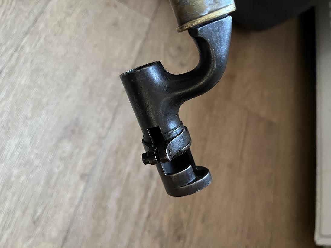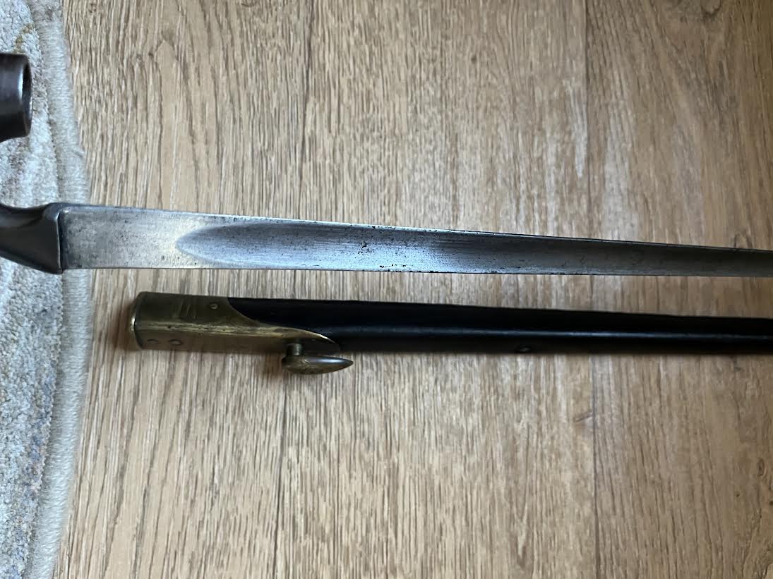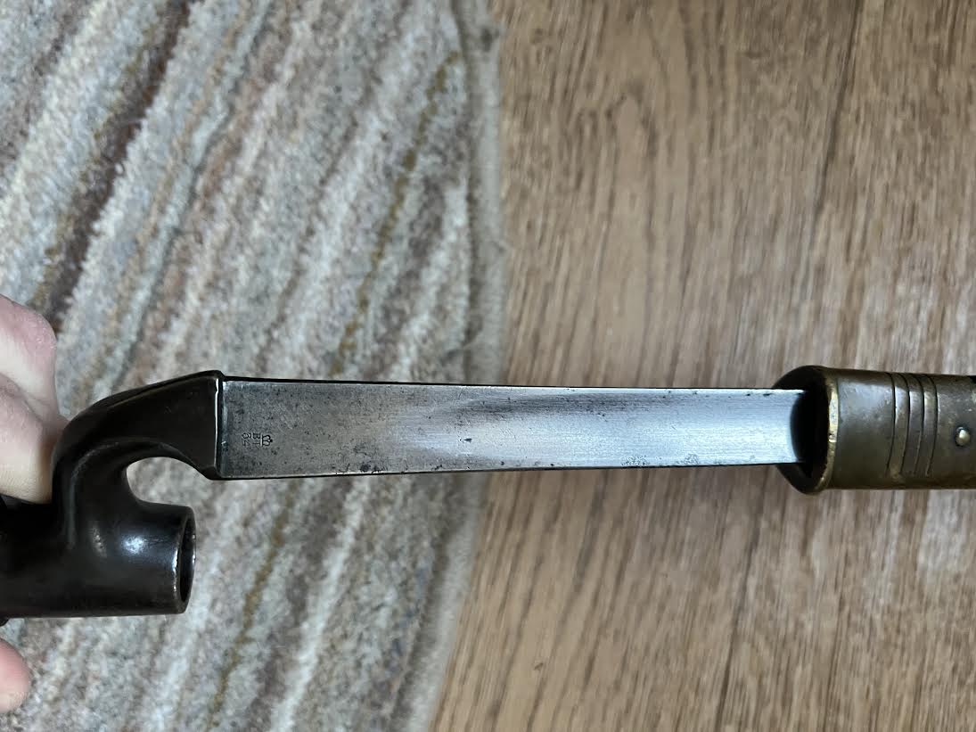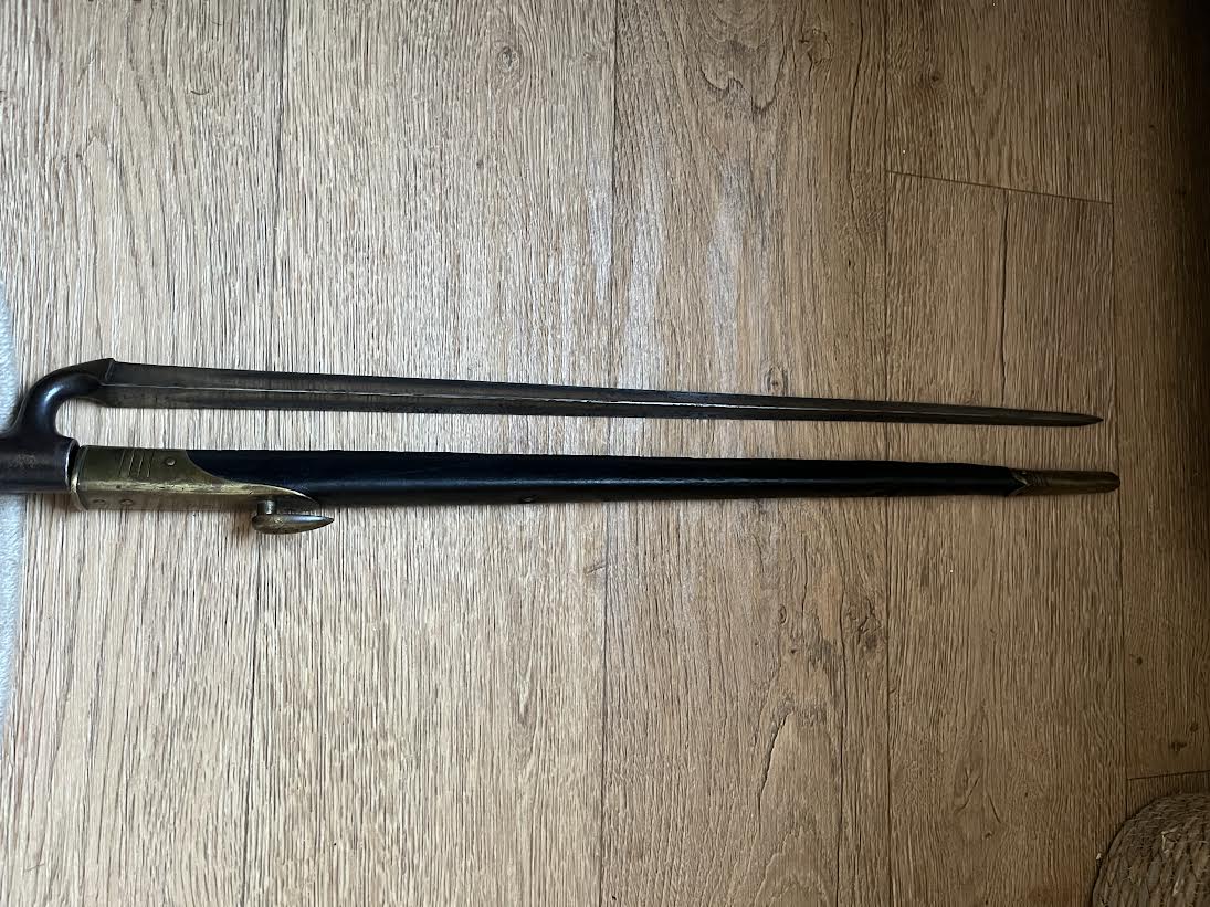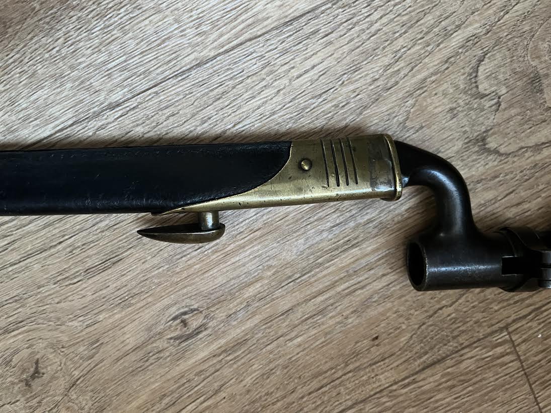 The Martini Henry Pattern 1876 socket bayonet, officially named the “Bayonet Common Long” was nicknamed the "Lunger" by the troops. The blade is triangular with blunt edges and was purely a stabbing weapon. Bayonets were marked with the War Department WD and arrow stamp and an Enfield Viewing mark. Initially there was no date of manufacture but this was added to the forte after July 21st 1882. The majority of these bayonets were manufactured by the Royal Small Arms factory Enfield.The 550mm tri-form blade is in good condition with small areas of tarnish. This example has the date of 5/88 for May 1888. The lack of a British sold out of service stamp could suggest that the bayonet was a captured weapon or never offically left the Army. The socket is in good condition with its original blueing remaining. There are some small dings and wear to the blued finish. The mortise ring on the socket works perfectly.The brass mounted black leather scabbard is in very good condition. The absence of brass rivets on the period made scabbard suggest that it was colonially made. The brass locket with integral teardrop frog stud has a few markings as shown. The brass chape is also marked. The leather is in good condition and strong with a some of the seem coming apart as shown but this does not effect the scabbard.The scabbard has an internal spring that gives it rigidity and helps hold the bayonet firmly within.This is a good and interesting example of the iconic Anglo-Zulu War Martini Henry bayonet.