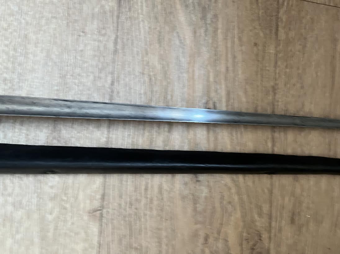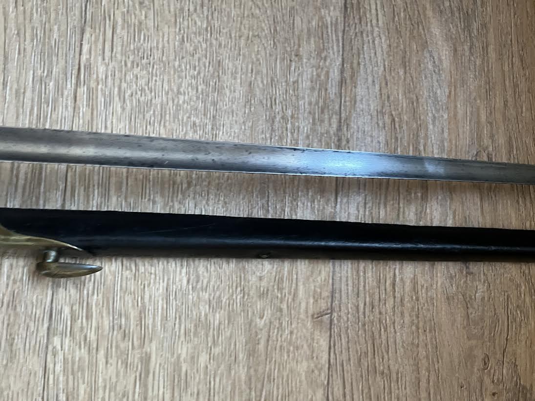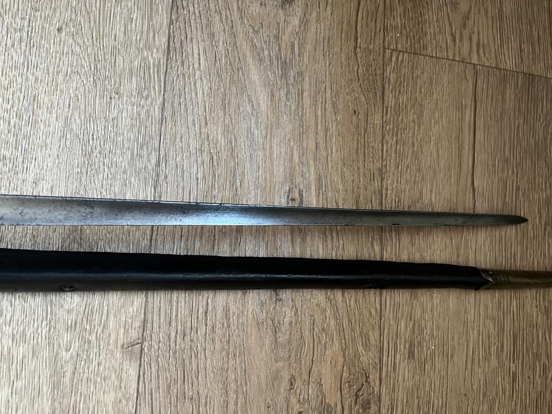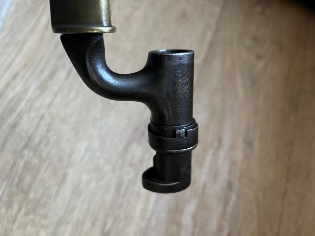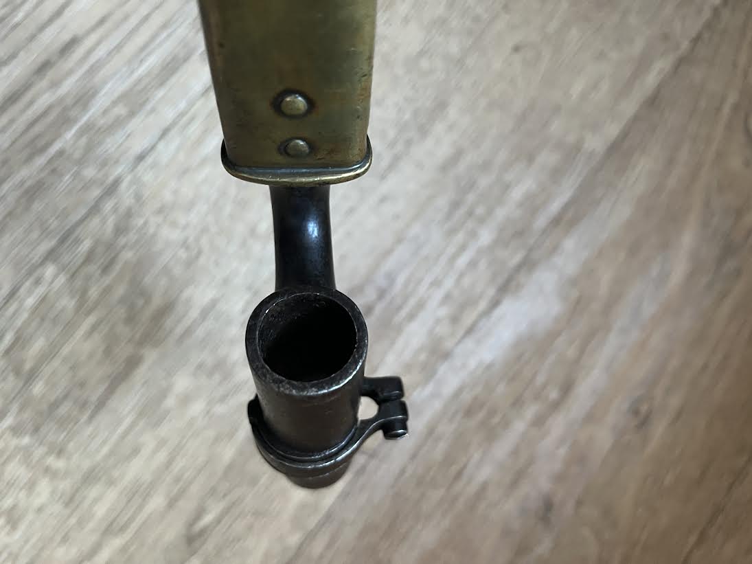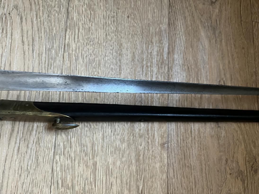 The Martini Henry Pattern 1876 socket bayonet, officially named the “Bayonet Common Long” was nicknamed the "Lunger" by the troops. The blade is triangular with blunt edges and was purely a stabbing weapon. Bayonets were marked with the War Department WD and arrow stamp and an Enfield Viewing mark. Initially there was no date of manufacture but this was added to the forte after July 21st 1882. The majority of these bayonets were manufactured by the Royal Small Arms factory Enfield.The 550mm tri-form blade is in good condition with small areas of tarnish. This example has the date of 5/88 for May 1888. The lack of a British sold out of service stamp could suggest that the bayonet was a captured weapon or never offically left the Army. The socket is in good condition with its original blueing remaining. There are some small dings and wear to the blued finish. The mortise ring on the socket works perfectly.The brass mounted black leather scabbard is in very good condition. The absence of brass rivets on the period made scabbard suggest that it was colonially made. The brass locket with integral teardrop frog stud has a few markings as shown. The brass chape is also marked. The leather is in good condition and strong with a some of the seem coming apart as shown but this does not effect the scabbard.The scabbard has an internal spring that gives it rigidity and helps hold the bayonet firmly within.This is a good and interesting example of the iconic Anglo-Zulu War Martini Henry bayonet.