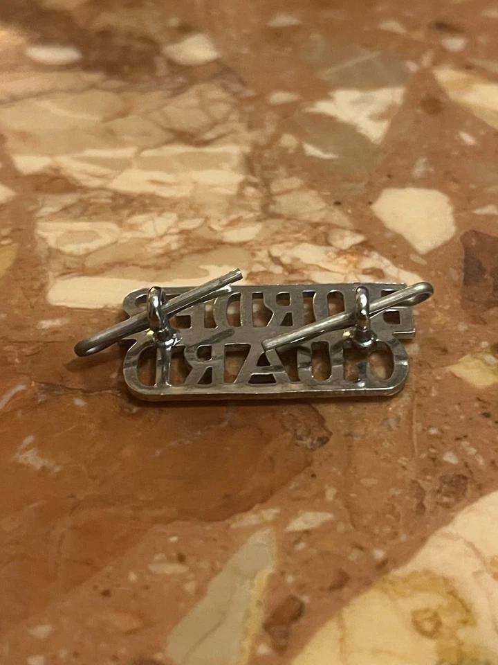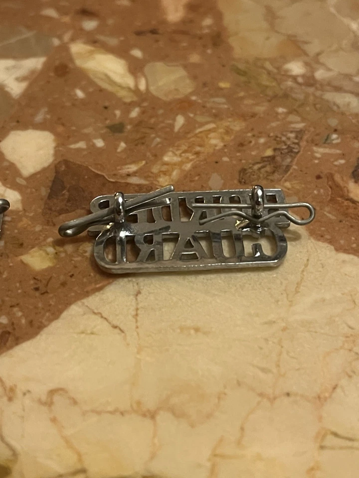 This is a pair of Border Guard Chrome-Finished Shoulder Title, As Worn On Epaulettes. Constructed In One-Piece Die-Cast Metal With A Polished Chrome Finish, The Title Is Cut Out In Block Letters Reading Border Guard. We are unsure exactly what country they are from but we believe they are most likely British. These are both complete with there original retaining pins as shown.