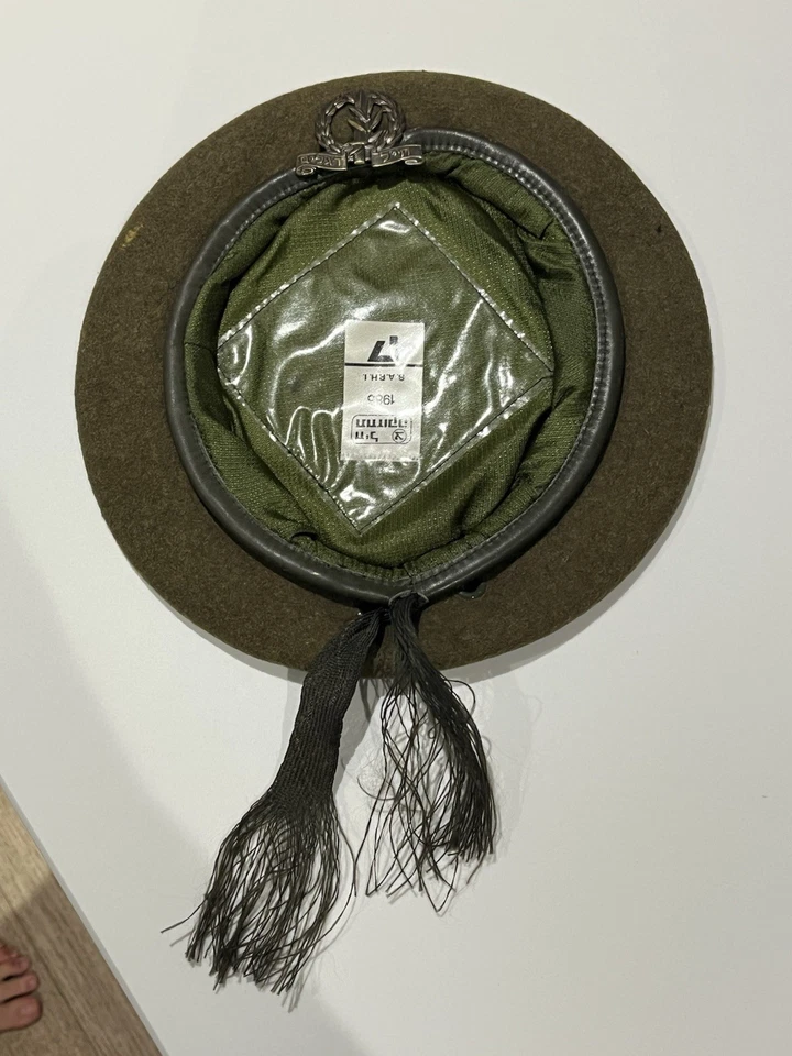 This is a Genuine Israel IDF Army Beret Dated 1985 In A Size 7 (56cm) With Minor Wear. This example is an original 1980s IDF beret. This example looks to have not been shaped or used since it was made. It has its original cord still attached as well as its original beret cap badge. It is in a size 7 which is 56cm. It has one very small stain and 1 hole also as shown. Please see photos for condition. The original liner has not been cut out or damaged.