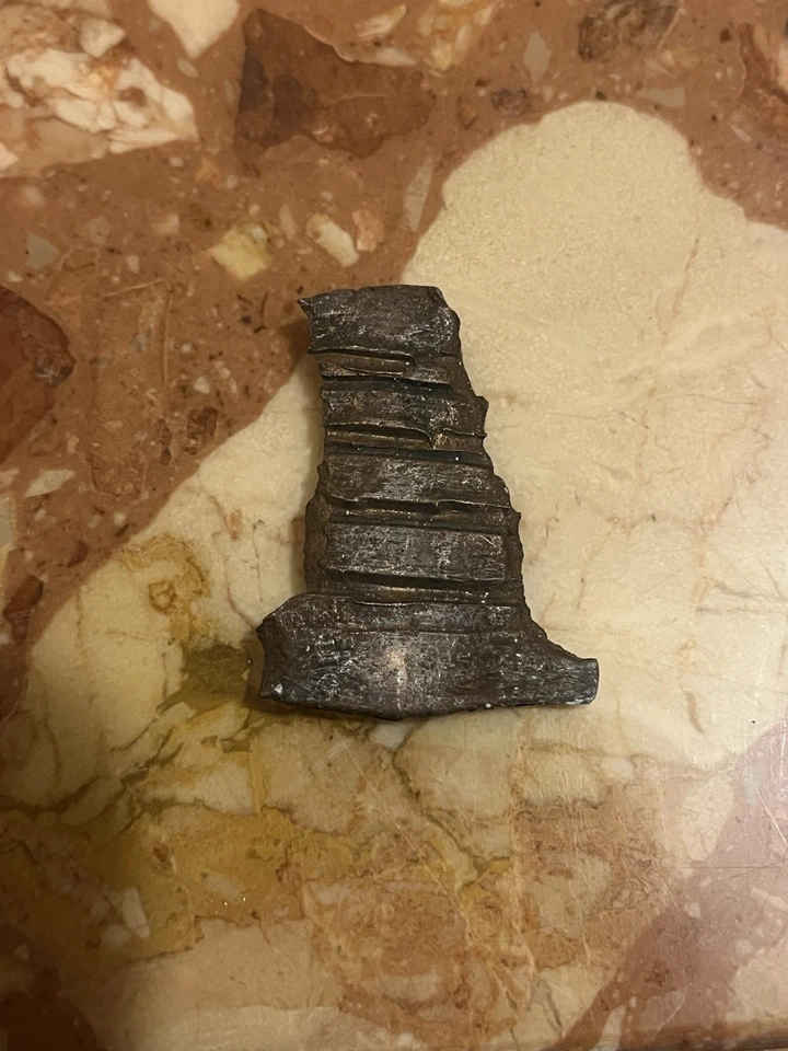 This is a Genuine WW1/2 Small Brass Driving Band Shrapnel Piece UnCleaned. This is part of the brass driving band which would have fitted around the top of the shell. This was used to spin in the barrel which leaves the large strips as shown. This has then blown up and turned into a deadly piece of shrapnel. Sadly we don’t know where this piece has come from.