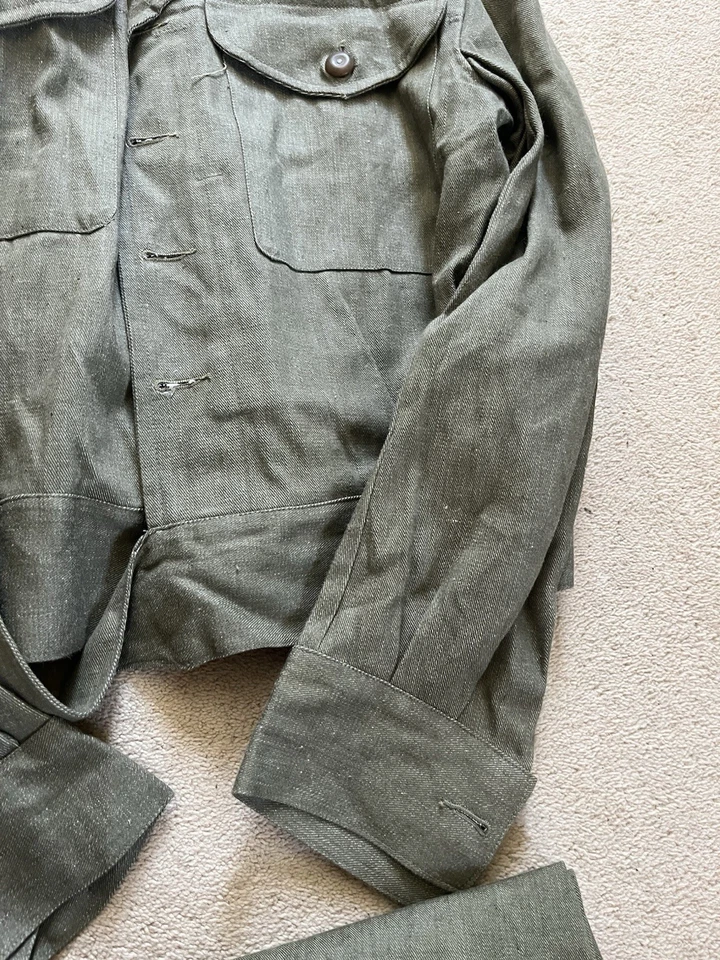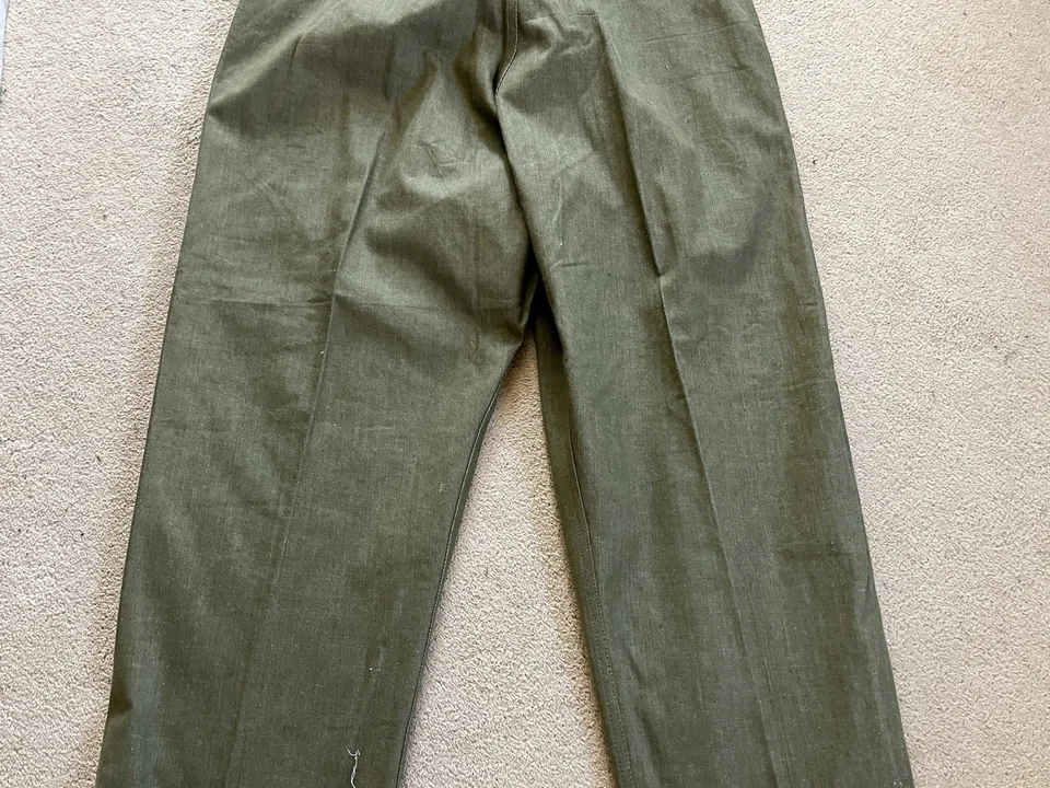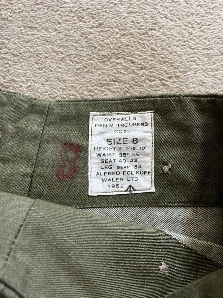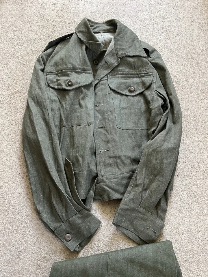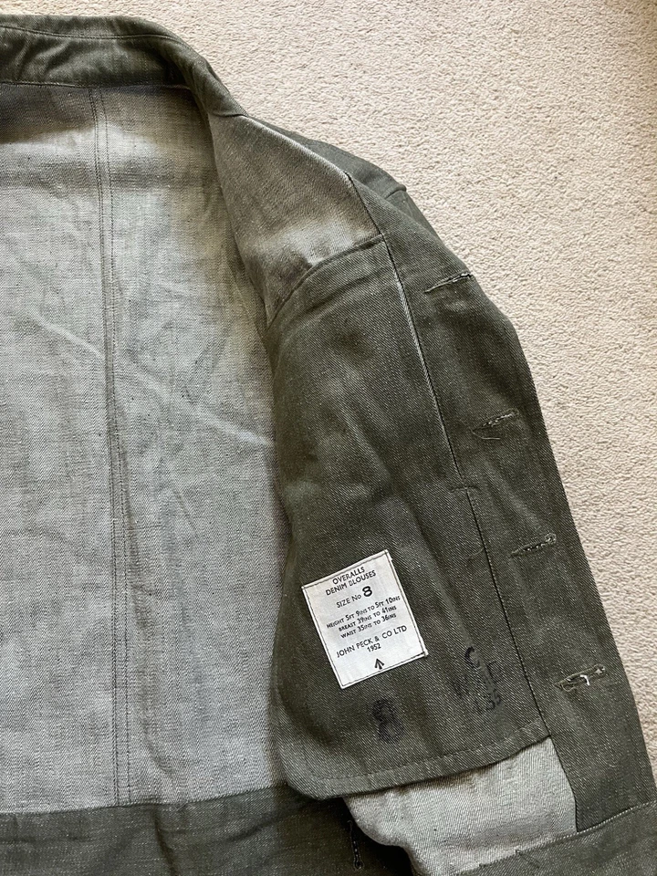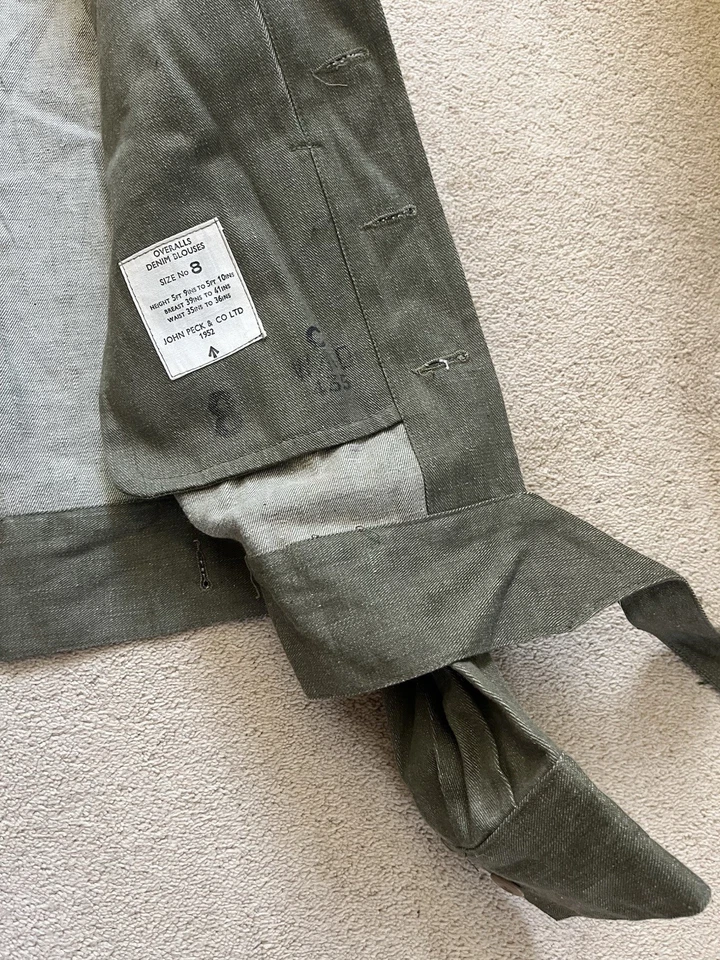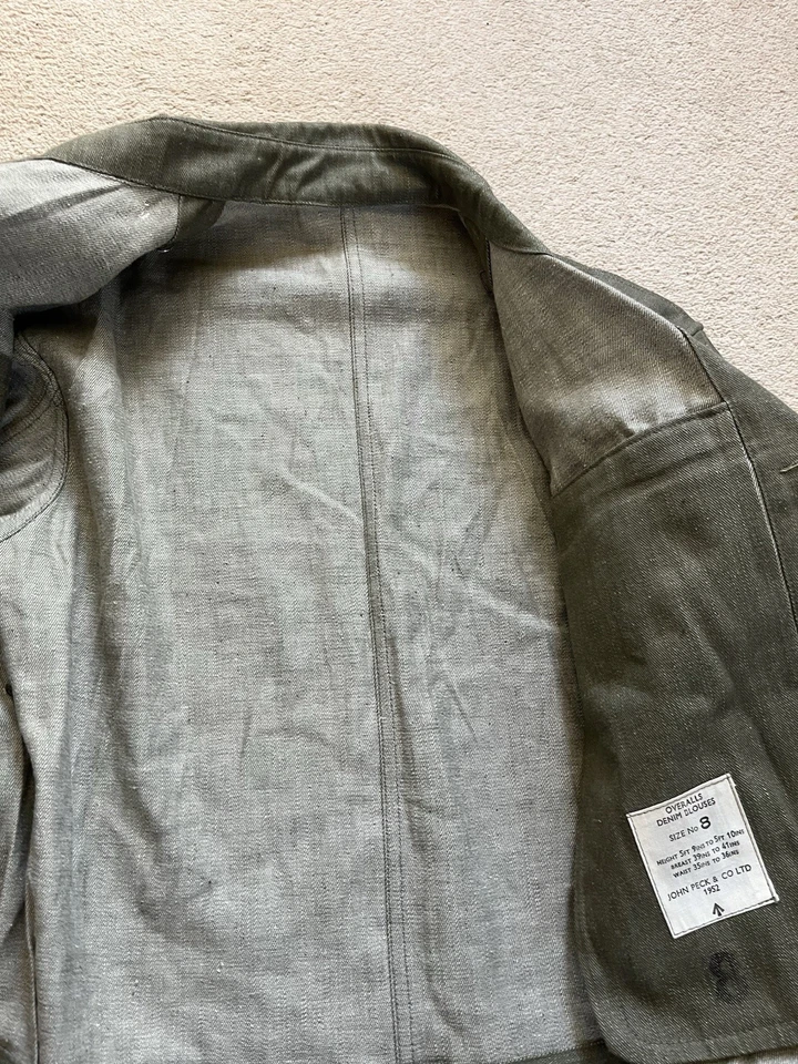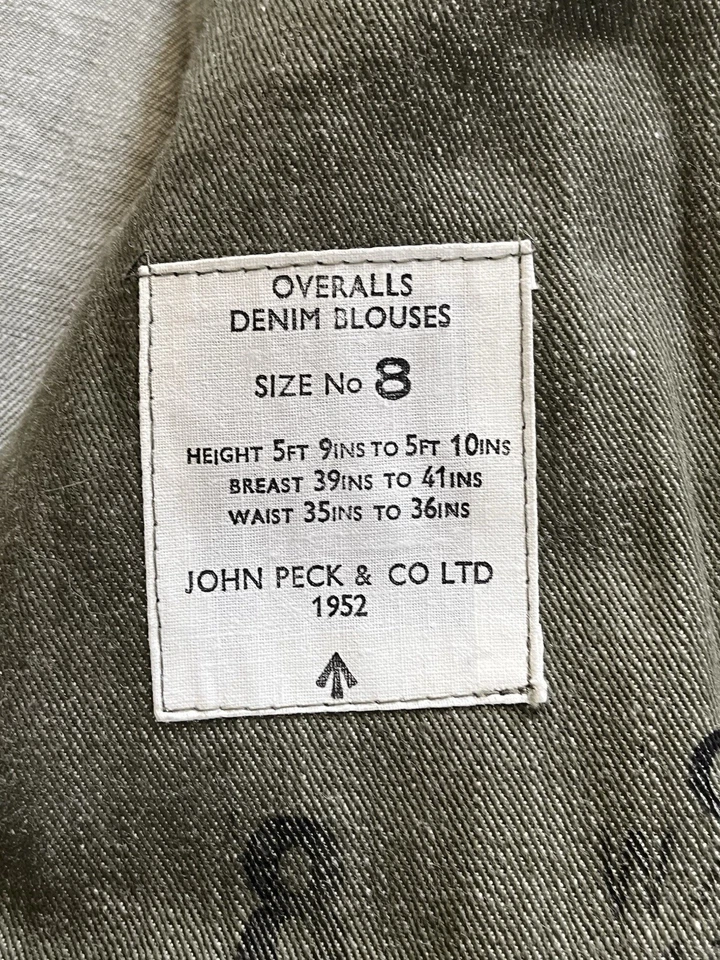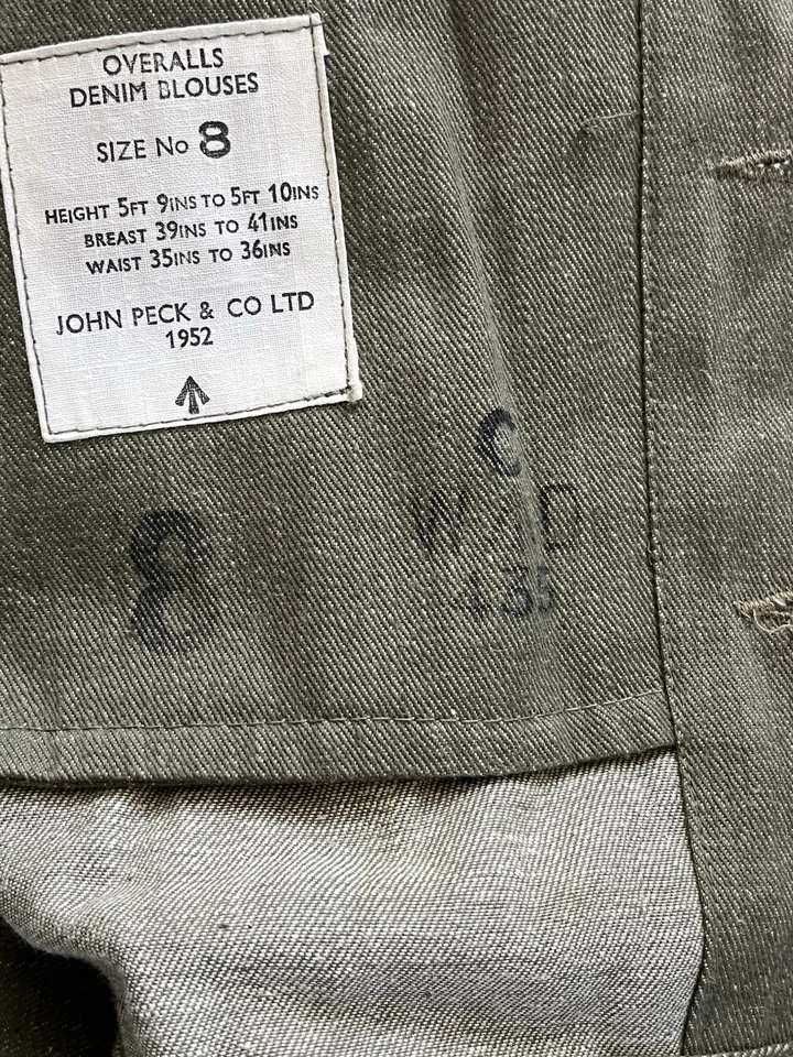 This is an original British Army Denim Battledress Blouse and trousers dated 1952 and 1953 in a size No. 8 both the jacket and trousers.Introduced at the beginning of the Second World War as a replacement for the earlier fatigues issued in the Great War and inter-war periods, the design closely followed the serge Battledress introduced in 1940 but was made from denim and had removable buttons. This is a second pattern or 'austerity' version which does not feature the pleated pockets of the first pattern jacket.The jacket and trousers are made from the standard denim material and features pockets to the chest and trousers as shown. It features various coloured revolving shank buttons which are held on with period split rings to the reverse whilst the waist fastens with a roll type buckle.Inside the jacket the original label is still present and is still legible. The 1952 date is towards the bottom of the label as is the War Department broad arrow marking and various details relating to sizes. The makers name “John Peck & Co LTD. Which is present. The trousers are made by ALFRED POLIKOFF WALES LTD.The jacket is designed to fit a 39” to 41” chest and when laid flat the jacket measures -The trousers are made to fit a 35-36” waist as shown in the label.The jacket and trousers are in good condition as can be seen in the pictures. It has very minor wear. Overall they are both a very wearable or displayable set. Please see photos for condition.A nice original example of a Denim Blouse and trousers set in good wearable condition.This is a vintage item which is 'sold as seen'