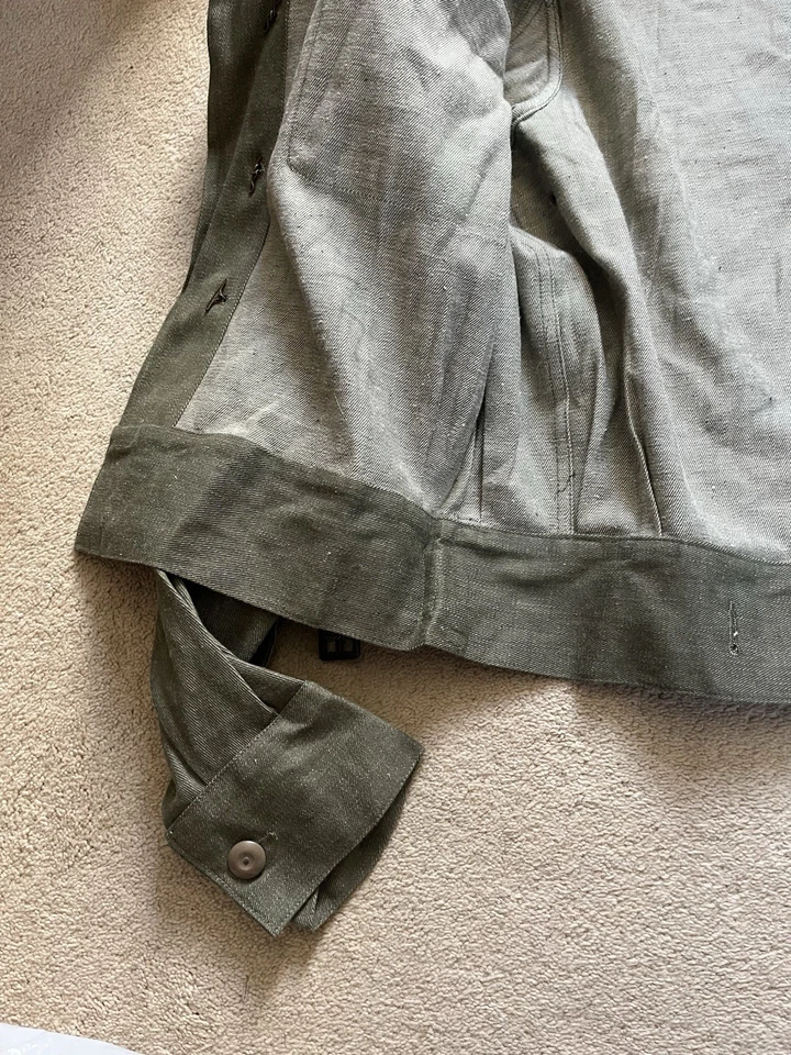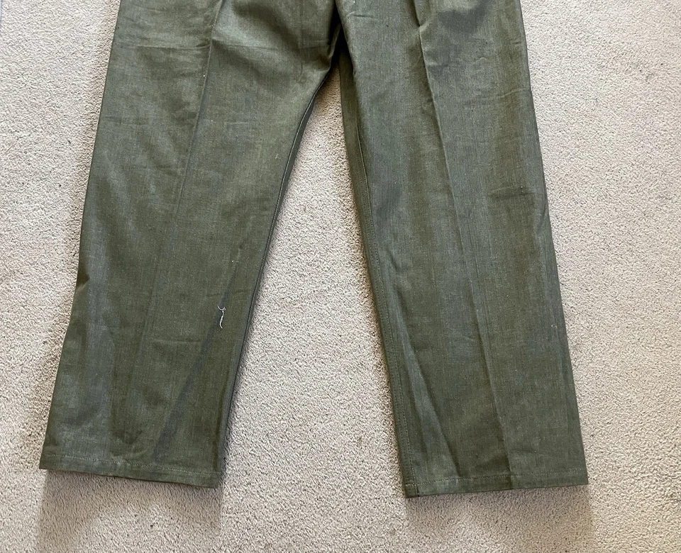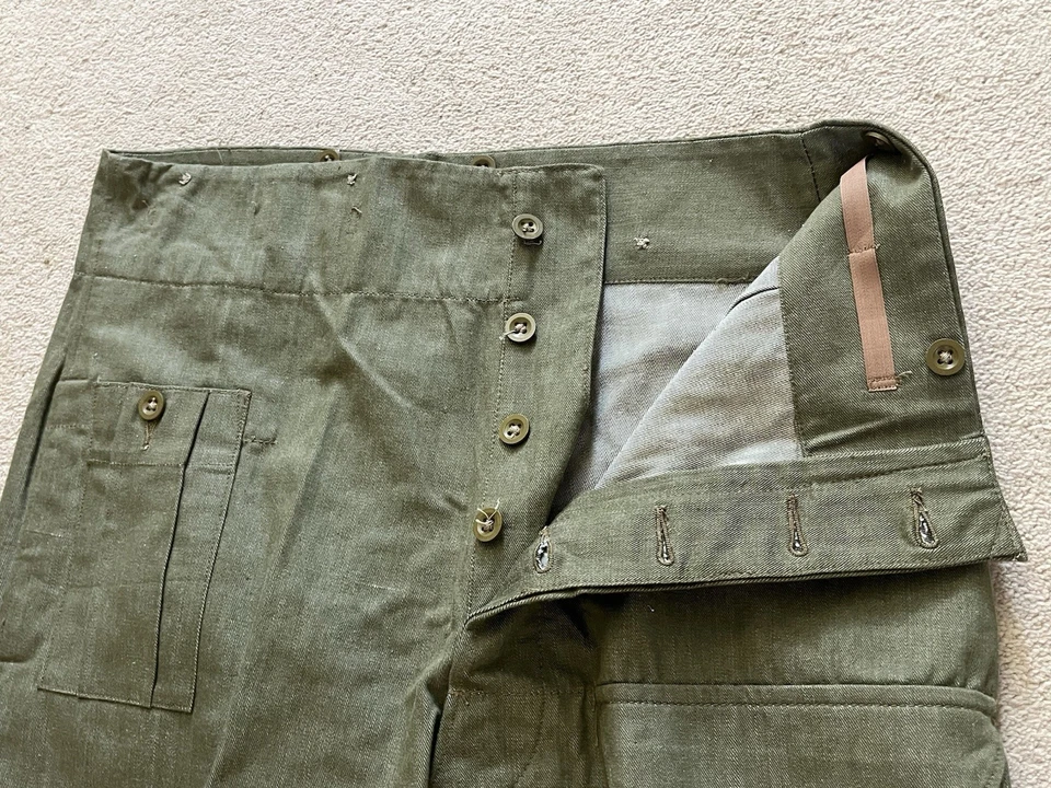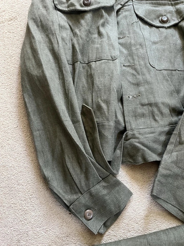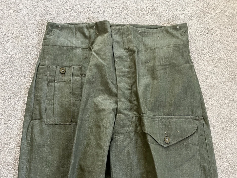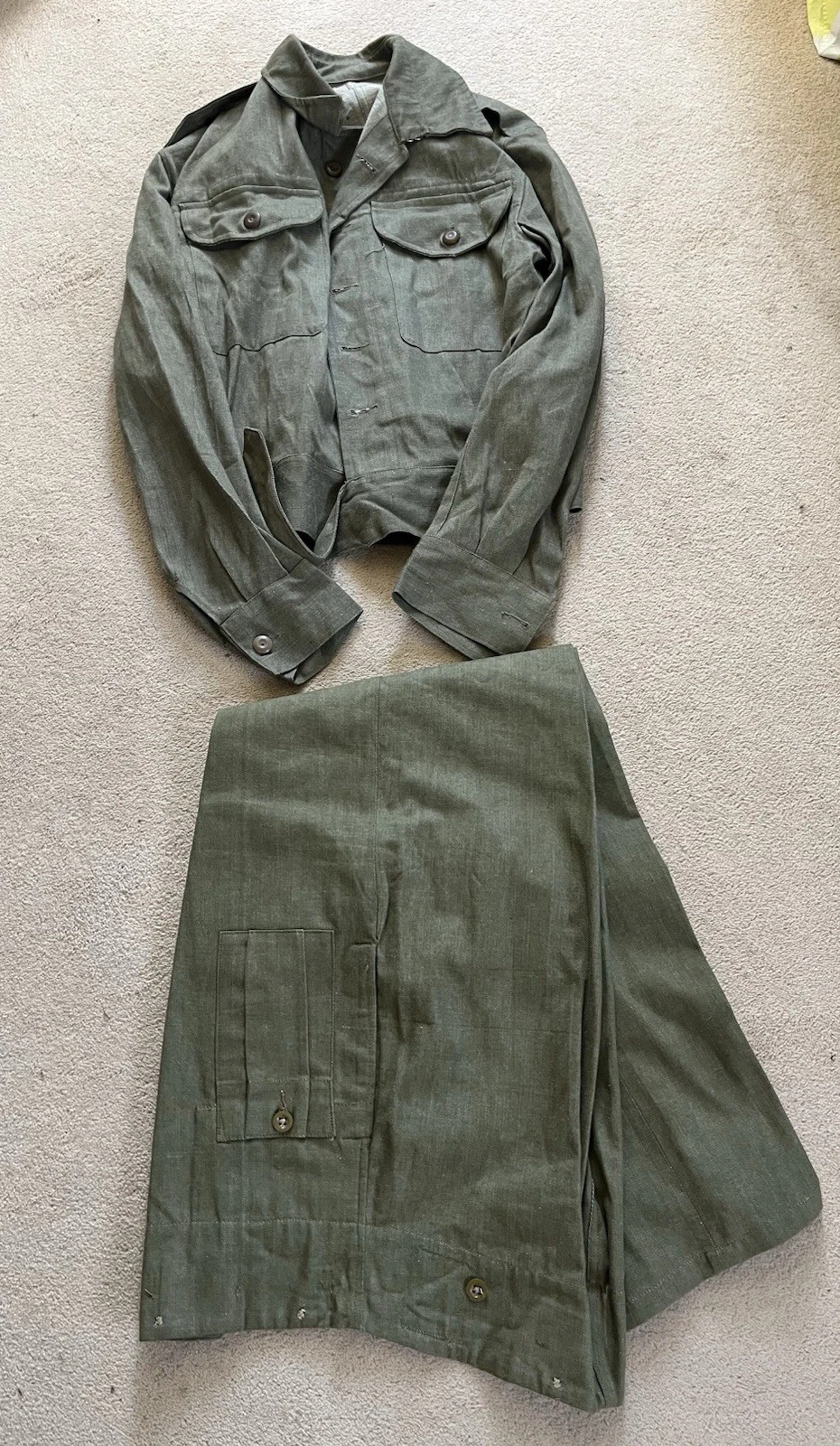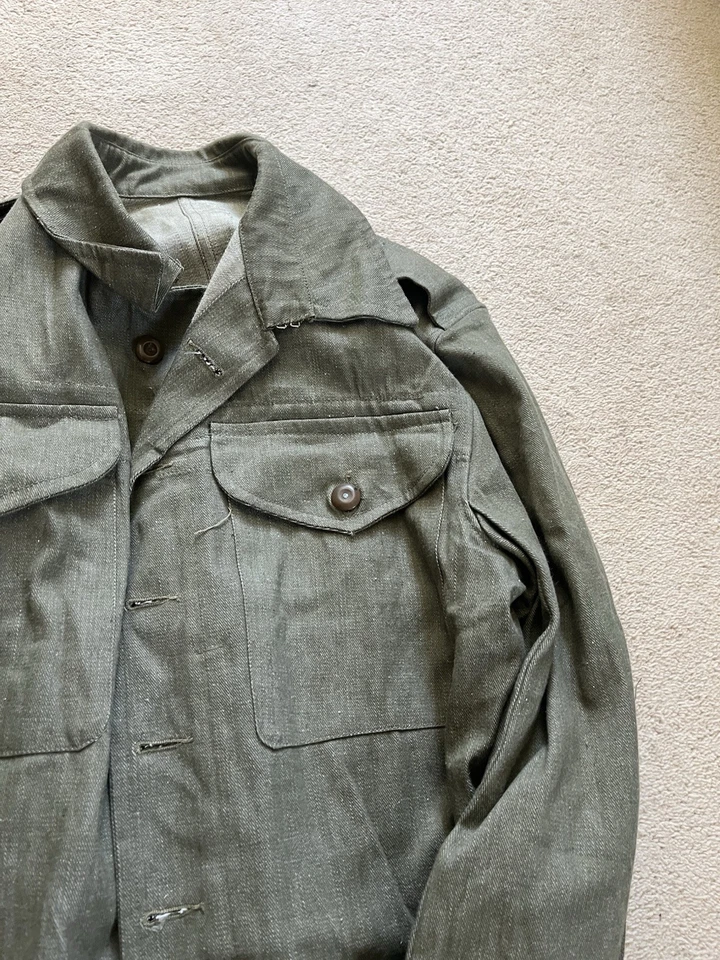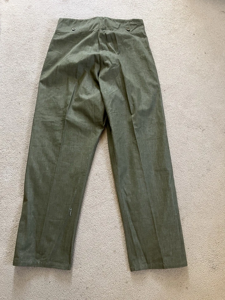 This is an original British Army Denim Battledress Blouse and trousers dated 1952 and 1953 in a size No. 8 both the jacket and trousers.Introduced at the beginning of the Second World War as a replacement for the earlier fatigues issued in the Great War and inter-war periods, the design closely followed the serge Battledress introduced in 1940 but was made from denim and had removable buttons. This is a second pattern or 'austerity' version which does not feature the pleated pockets of the first pattern jacket.The jacket and trousers are made from the standard denim material and features pockets to the chest and trousers as shown. It features various coloured revolving shank buttons which are held on with period split rings to the reverse whilst the waist fastens with a roll type buckle.Inside the jacket the original label is still present and is still legible. The 1952 date is towards the bottom of the label as is the War Department broad arrow marking and various details relating to sizes. The makers name “John Peck & Co LTD. Which is present. The trousers are made by ALFRED POLIKOFF WALES LTD.The jacket is designed to fit a 39” to 41” chest and when laid flat the jacket measures -The trousers are made to fit a 35-36” waist as shown in the label.The jacket and trousers are in good condition as can be seen in the pictures. It has very minor wear. Overall they are both a very wearable or displayable set. Please see photos for condition.A nice original example of a Denim Blouse and trousers set in good wearable condition.This is a vintage item which is 'sold as seen'