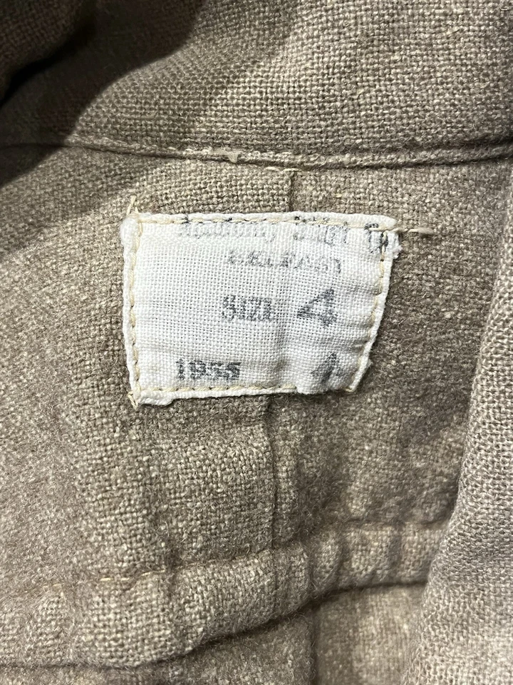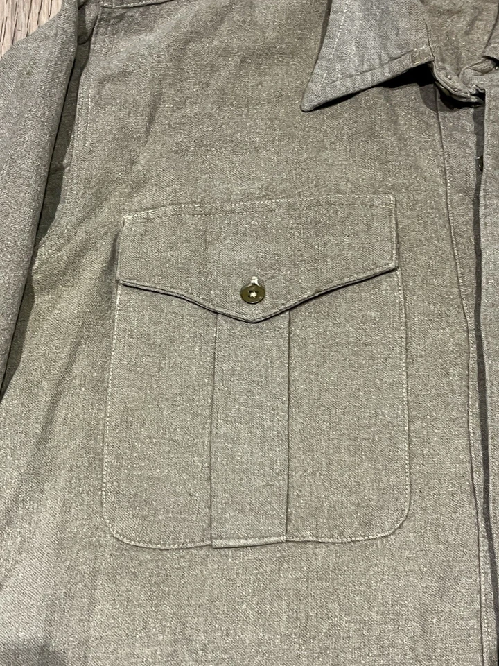 An original post-WW2 British Army Other Ranks shirt by 'Faulat' of Belfast.The shirt is similar to the pattern introduced by the British Army in late 1944 making it a good substitute for a mannequin or re-enactment. It features a spearpoint collar typical of the period and two breast pockets.The shirt is made from the same khaki wool as earlier examples and retains its original manufactures label inside the neck which bares the War Department broad arrow stamp as well as the 1955 date and size.The shirt is a medium size 4. Original period shirts in this Medium size are hard to find today!The overall condition is good and the shirt doesn't show any real signs of wear. There is a lack of consistency to the colour of the top and bottom halves of the shirt as can be seen in the first picture but this doesn't detract from the shirt when worn or displayed, it has some minor wear on the inside of the collar as shown.All in all a nice medium size British Army shirt ideal for a mannequin or a re-enactor.