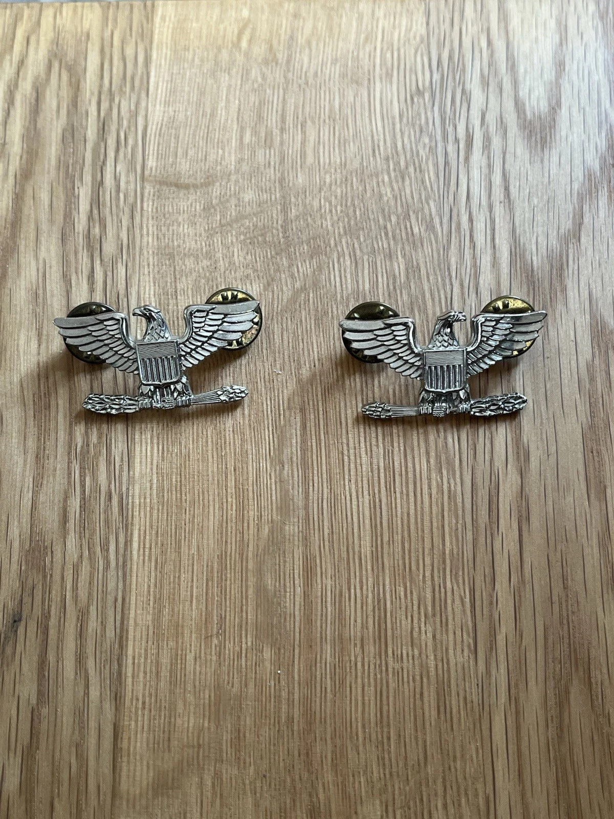 This is an Original US Army Officers Colonel Rank Badge Pair In White Metal Full Size. This example is in good condition all round with both rear pins complete in very good condition. It has both its rear pin clips as well. These are issued to colonies in the US army. Please see photos for condition.
