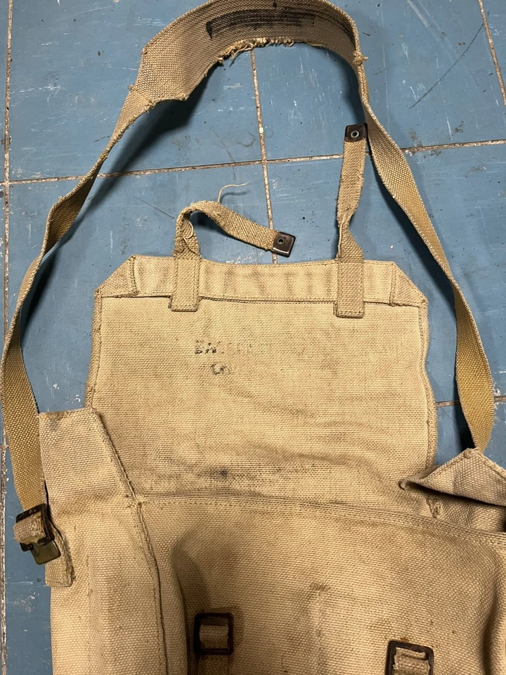 This is a genuine Original WW2/ Post War British Army Small Pack No Blanco Applied No Date. This example is in very good condition all round with no wear or holes. It has some markings with what would have been the maker and date. It has had no blanco applied. It has not had the rear clips removed. It does have a strap which means it was made into a satchel instead of a small pack. Please see photo for condition.