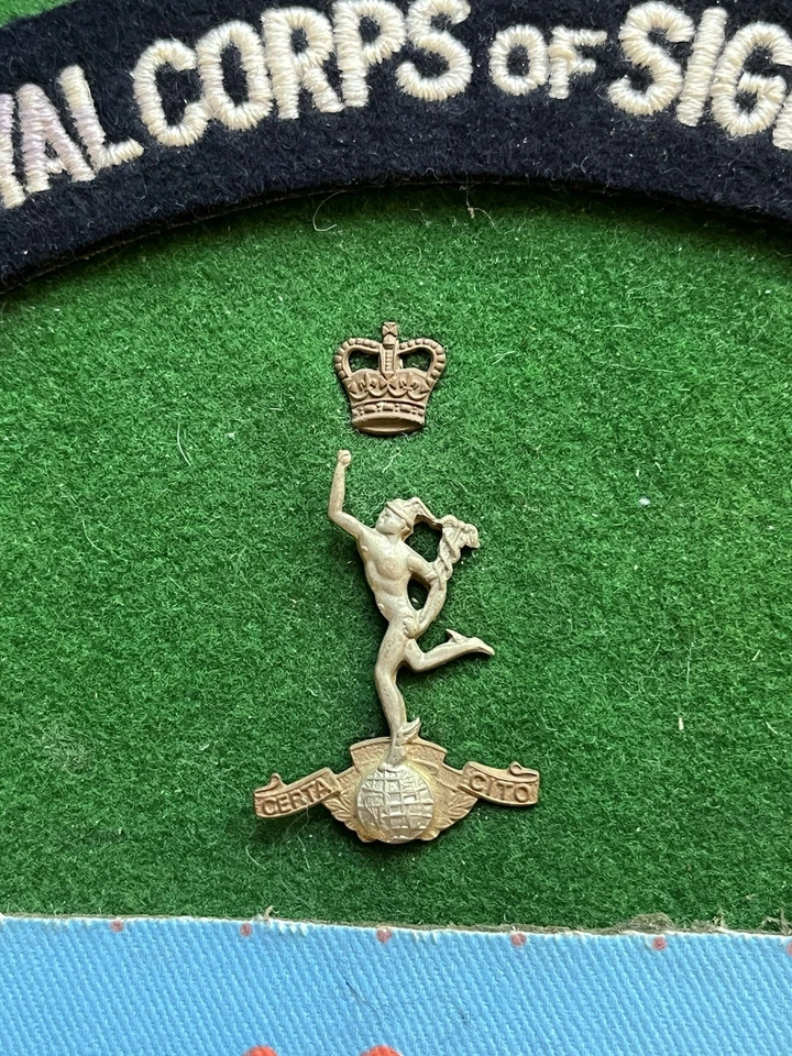 This is a Post War British Army Royal Signals Commemorative Brass Plaque. This example is in very good condition all round with minor wear. It has a brass queens crown cap badge, a cloth royals signals shoulder title and an Air formation signals patch. Next to this trio is a brass Avro Lancaster brass plaque. This is a nice grouping most likely put together by an ex serviceman who would have worked on Avro Lancaster's post war. Please see photos for condition. This could be wall mounted if wished.