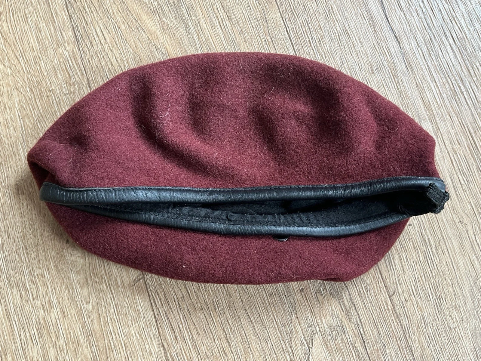 This is a Reproduction 1944 Dated Kay Kanvas Maroon Beret Size 58cm with Minor Wear. This example is a replication example copied from the war time made examples. It is dated 1944 and is a size 7 1/4 which is 58cm. It has a small hole in the front were a cap badge would have sat at one point. It still has its original cord in the leather strap. Please see photos for condition.