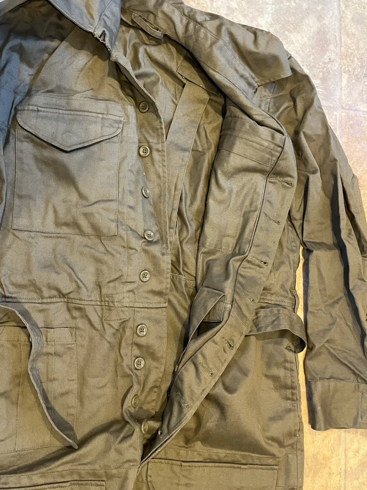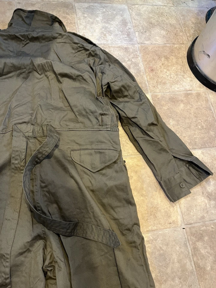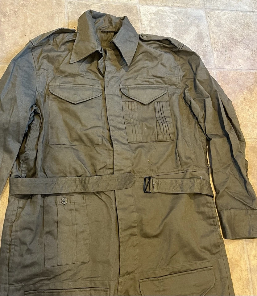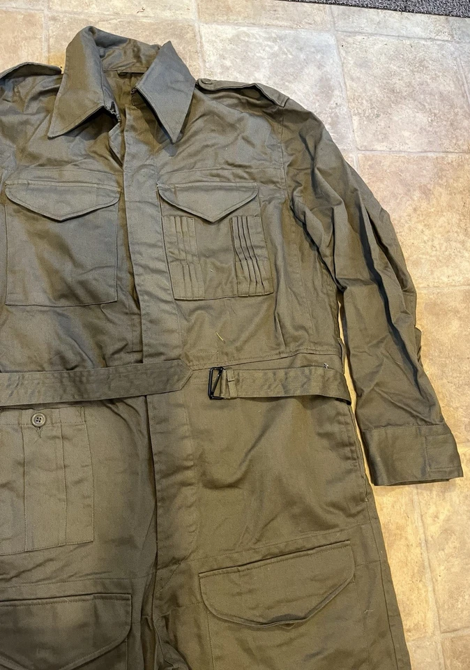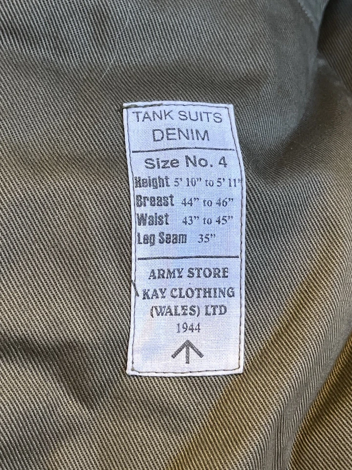 WW2 British Army Denim tank suit by Kay CanvasThese were issued in 1944 to replace the 2 piece denim suit and the denim work overalls.This Denim Tank Suit has been made like the originals using the correct coarse weave of denim fabric which has a green/ white fleck mixed together rather than vat dyed to olive green, this can been seen more clearly when you see the inside which is an off white. To finish this suit of Kay Canvas have used original vegetable fat buttons.They were issued to the following:Royal Armoured Corp and Royal Engineers who operated in armoured fighting vehicles.Royal artillery crewmen who operated Self Propelled gunsInfantry soldiers who operated scout cars.SIZING The Denim tank overalls were designed to be worn over a BD suit and so are made oversized, if you intend wearing it on its own without clothing then order a SMALLER SIZE.They were worn with Gaiters and ammo boots.Features:8 External pockets, 2 large breast pockets, 2 side pockets,2 knee pockets, hip pocket and a first field dressing pocket.Left hand breast pocket has pencil holders for map and radio work.Cloth beltCloth straps at end of legsInternal bracesShoulder straps for rankConcealed button front.This example is used but almost new condition with no wear damage or holes. This example is in a good size. It will fit a Large up to a XL. Please see photos for condition.