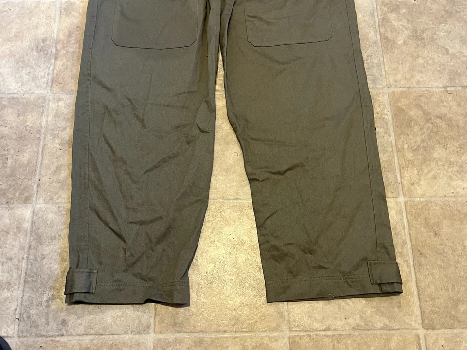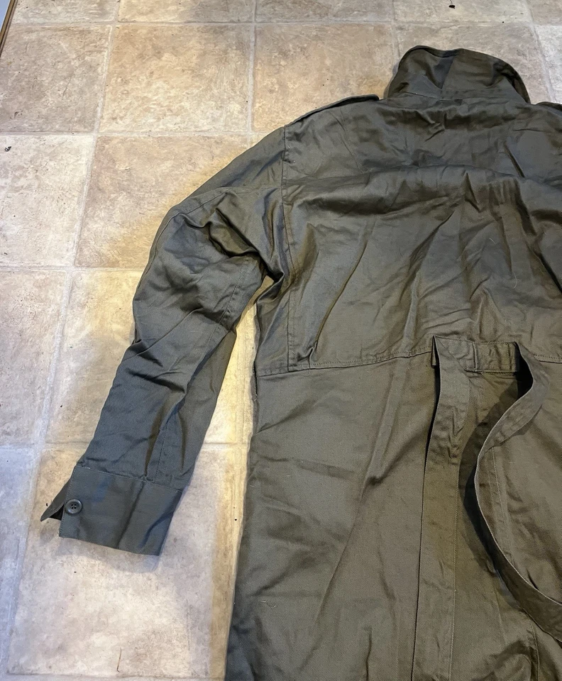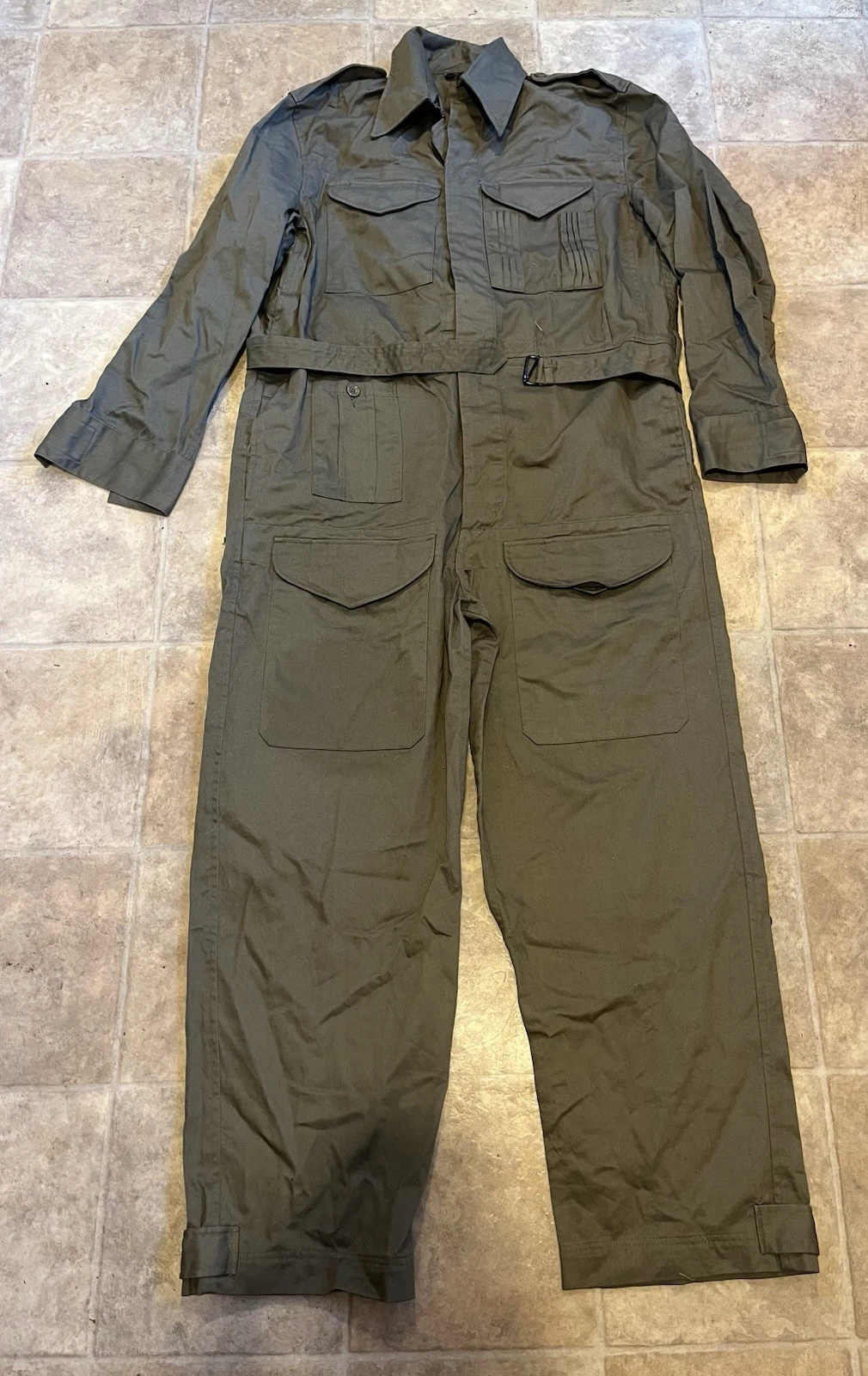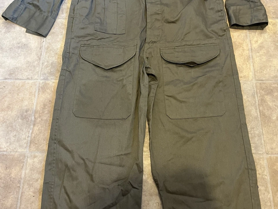 WW2 British Army Denim tank suit by Kay CanvasThese were issued in 1944 to replace the 2 piece denim suit and the denim work overalls.This Denim Tank Suit has been made like the originals using the correct coarse weave of denim fabric which has a green/ white fleck mixed together rather than vat dyed to olive green, this can been seen more clearly when you see the inside which is an off white. To finish this suit of Kay Canvas have used original vegetable fat buttons.They were issued to the following:Royal Armoured Corp and Royal Engineers who operated in armoured fighting vehicles.Royal artillery crewmen who operated Self Propelled gunsInfantry soldiers who operated scout cars.SIZING The Denim tank overalls were designed to be worn over a BD suit and so are made oversized, if you intend wearing it on its own without clothing then order a SMALLER SIZE.They were worn with Gaiters and ammo boots.Features:8 External pockets, 2 large breast pockets, 2 side pockets,2 knee pockets, hip pocket and a first field dressing pocket.Left hand breast pocket has pencil holders for map and radio work.Cloth beltCloth straps at end of legsInternal bracesShoulder straps for rankConcealed button front.This example is used but almost new condition with no wear damage or holes. This example is in a good size. It will fit a Large up to a XL. Please see photos for condition.
