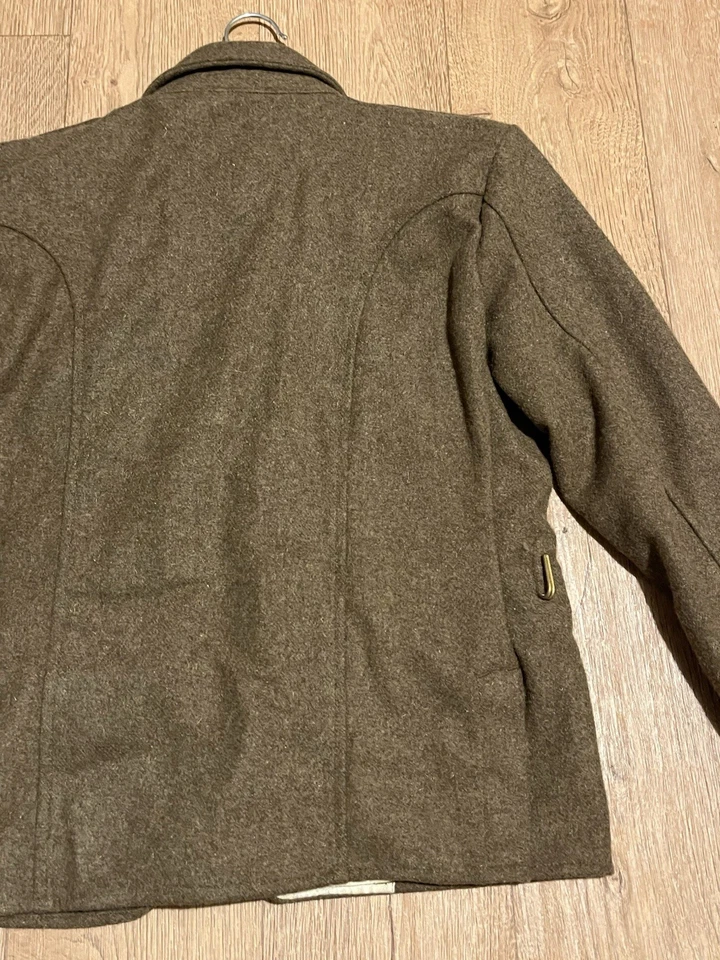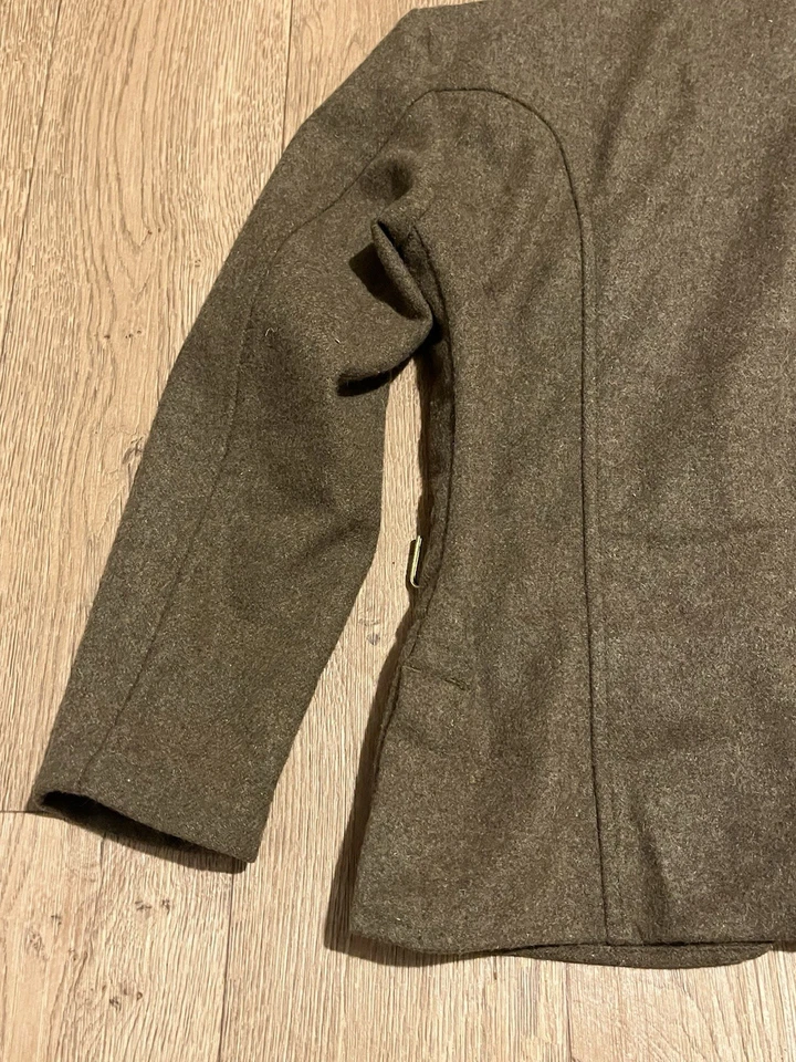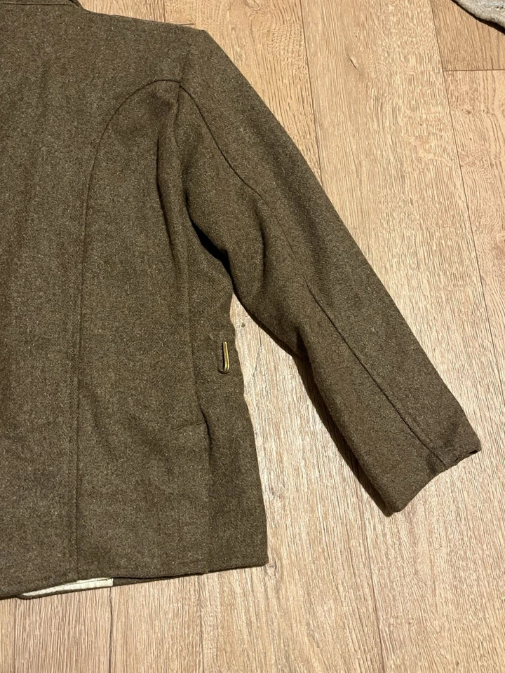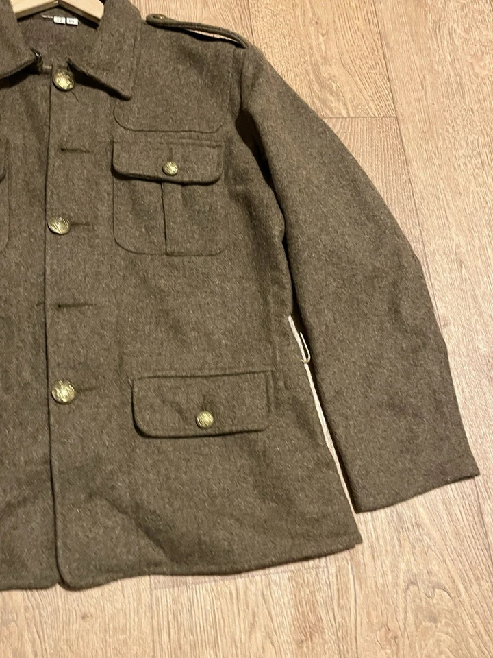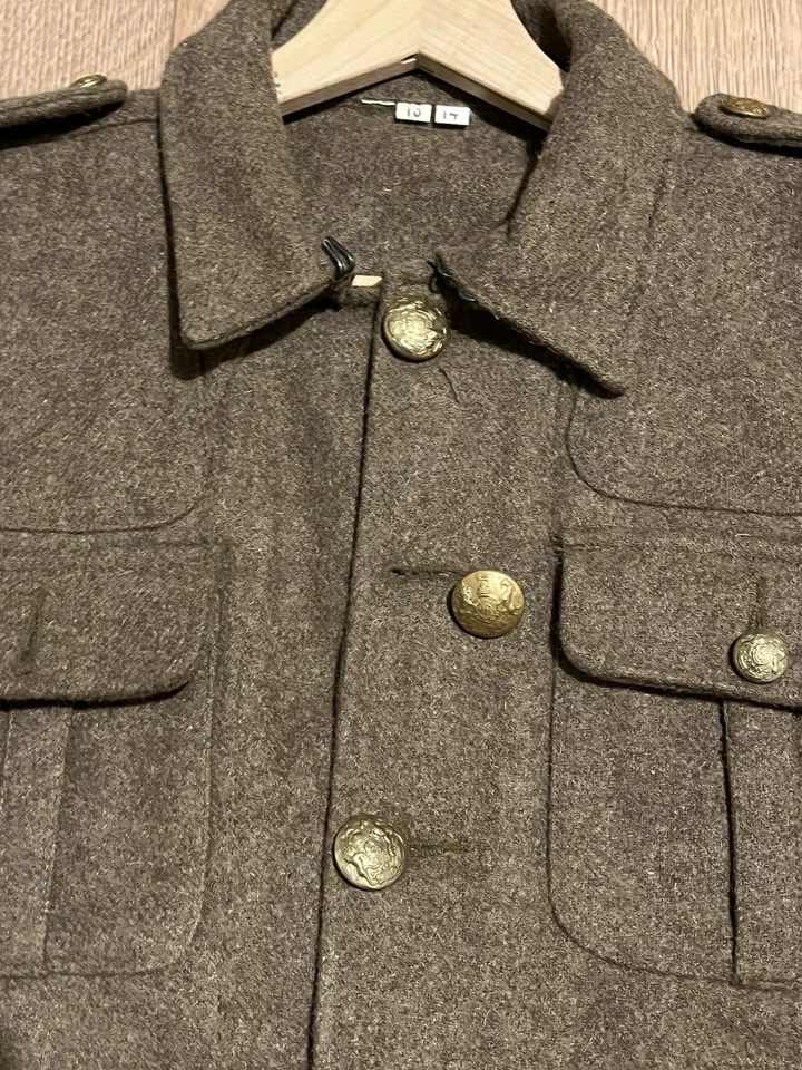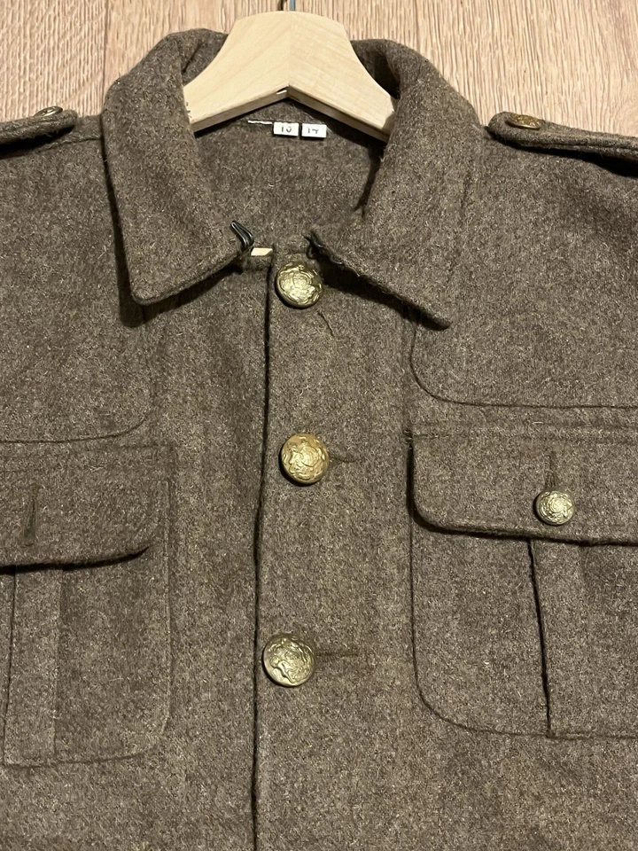 This is a Reproduction WW1 British Army 1902 SD Tunic Made By Kay Kanvas Size 13/14 years old. Childrens British Army WW1 SD Tunic in Kids SizeReplica tunic of the British Military Wool 1902 Service Dress tunic which was used by the British Army in the Great War of 1914 to 1918.The 1902 Pattern Service Dress tunic was the standard uniform clothing used by the British Army throughout the First World War.This example will fit up to a size 34” chest and the back length is 24” long.It is missing one button and another has come off but we still have that one.There are no holes or damage with no moth. Please see photos for condition.