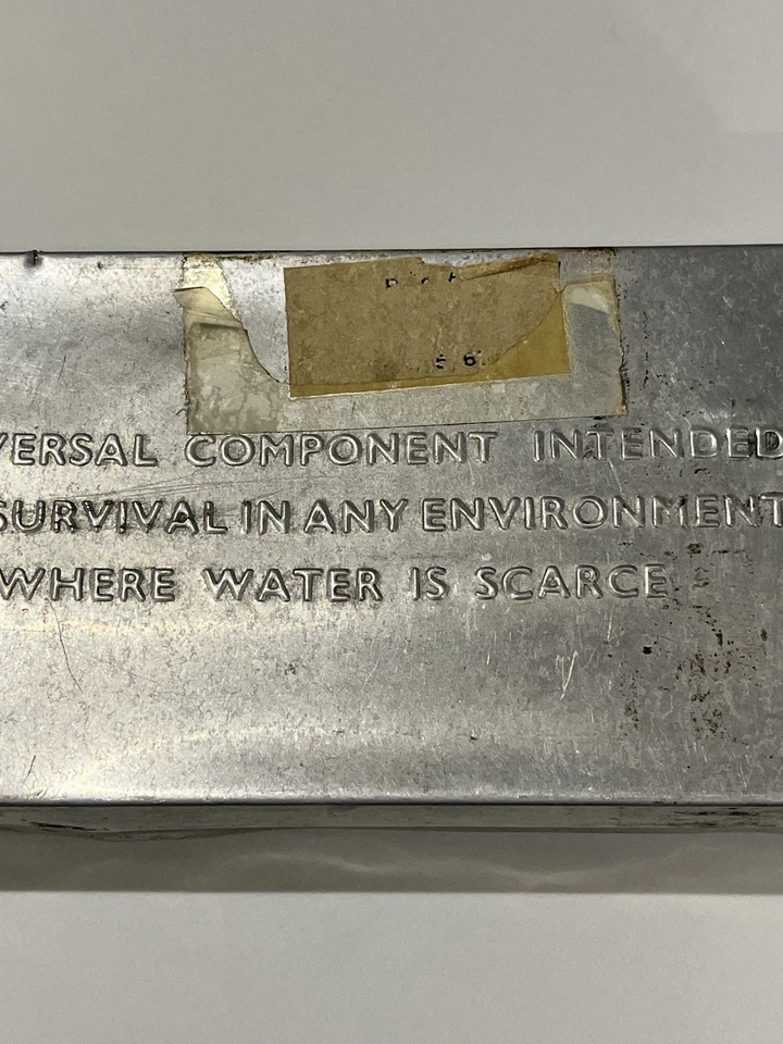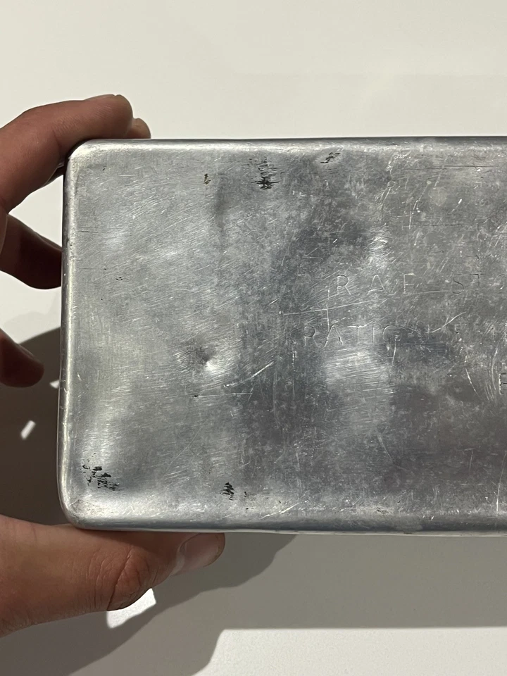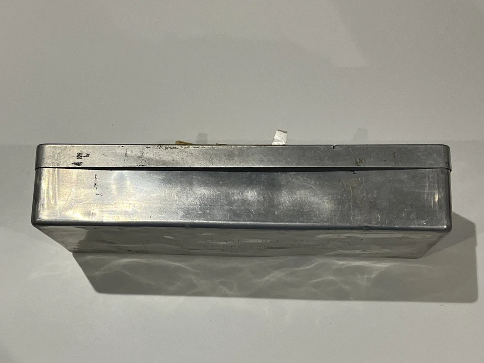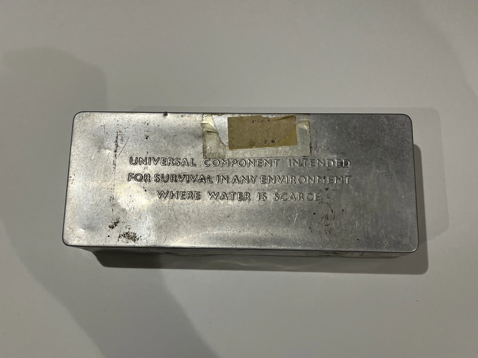 This exceptionally rare RAF MK5 Flying Ration from 1950s is a remarkable piece of British aviation history, offering a fascinating glimpse into mid-20th-century military logistics and survival planning. Developed for Royal Air Force crews, the MK5 ration was designed to provide essential nutrition and energy during long missions, ensuring pilots and aircrew could maintain peak performance in demanding conditions.The 1959 date adds significant historical value, marking a period when the RAF was transitioning from propeller-driven aircraft to cutting-edge jet technology during the Cold War. Collectors and historians will appreciate the pristine condition and authenticity of this item, which serves as a tangible link to the life of RAF personnel in this pivotal era.A must-have for serious collectors of military memorabilia, aviation history enthusiasts, or those fascinated by survival gear, this MK5 Flying Ration is an extraordinary artifact. Its completeness and excellent preservation make it a rare opportunity to own a piece of RAF heritage that is both historically significant and visually captivatingThis example is in good condition with some holes and damage to the bottom of the box. This example is empty but still has the metal work inside. It is dated to the 1950s n the top. Please see photos for condition.