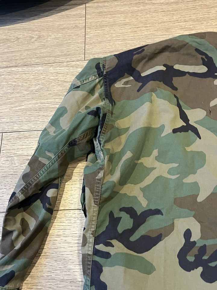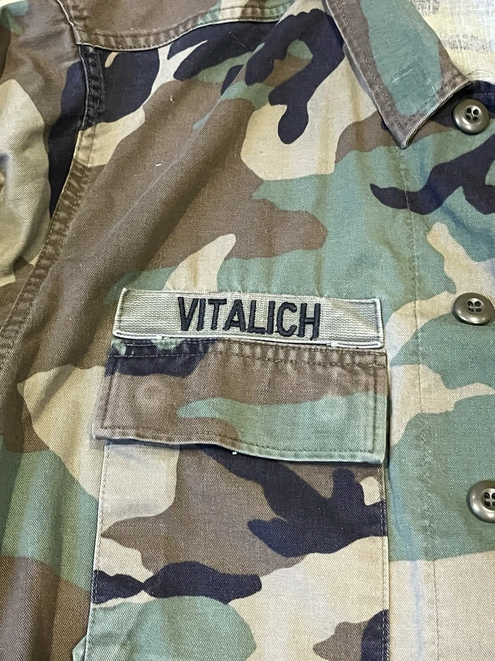 This is a genuine U S Army 11th Armoured Cavalry Regiment M81 Woodland Camp Jacket Size Small 33-37” chest. This example is in very good condition all round with only minor wear from age. It has all its original patches and labels. It has the patches of the 11th Armoured Cavalry Regiment. It also has US Army written on the chest along with the original owners last name “Vitalich”. This example is in a size small regular. It has had one very small hole as photographed which has then be repaired at some point.