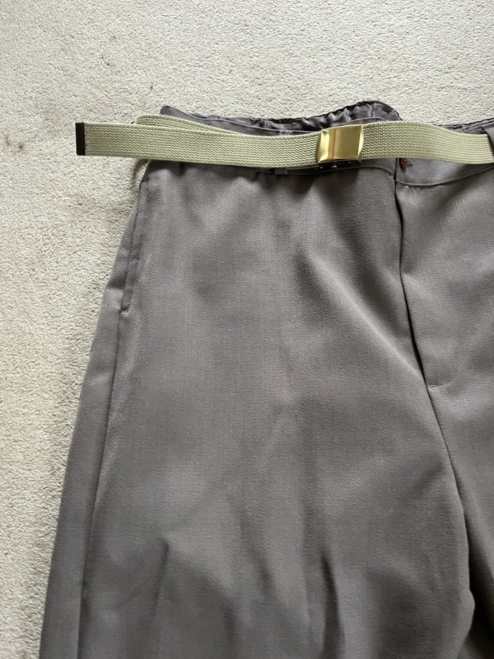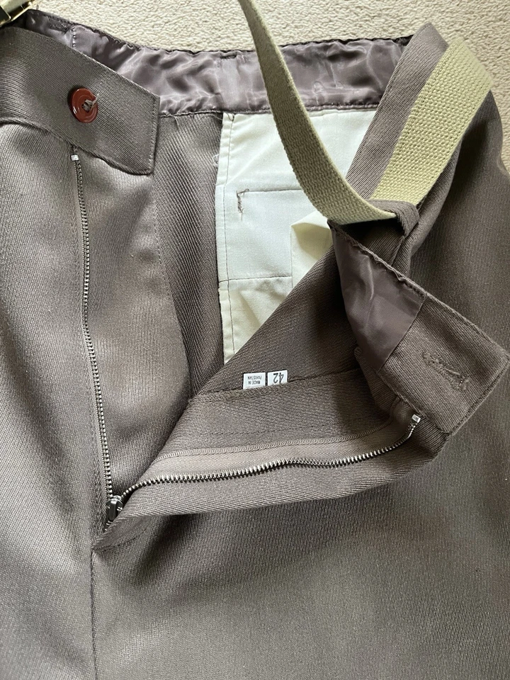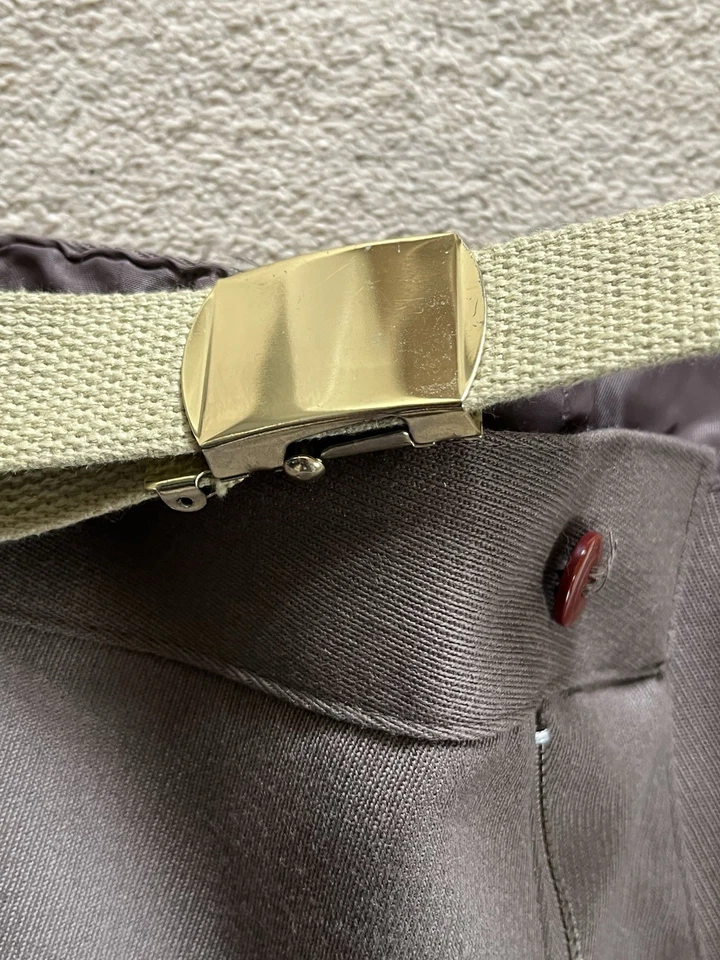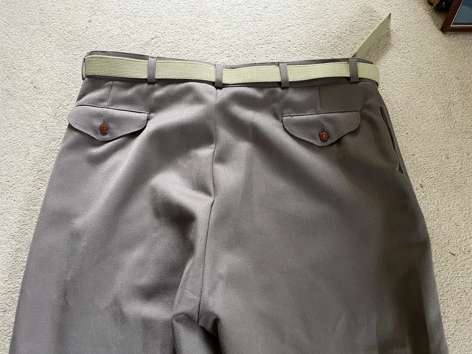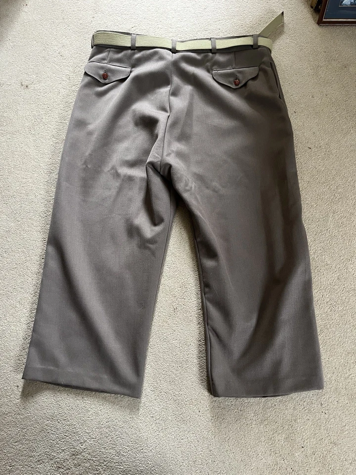This is a good condition reproduction set of Second World War American officer trousers. They are in a size 42” waist XL. These come with a reproduction brass officers belt as well. Please read the full description of these trousers below.American WW2 replica Officers dress trousers often called "Pinks".Officially called "Trousers, Wool, Elastique, Drab, Officer's" but most often just called Pinks.These where worn by all US Army officers including the Air force officers, Infantry officers, Armoured officers, medical officers, M.P. officers and Airborne Officer's in the 1940's as part of the officers dress uniform. The insignia would be different depending on the branch of service they are in.These would have been worn around the camp, in Headquarters and when on R&R leave.These are high quality replica trousers made in the correct 1940s high waist style. These are designed to be worn high just below your belly button. The sizes given are the actual size of the waist band (were the trouser belt loops are). These give a great original look to your WW2 period impression.These are made in the 1940s style with a high waist band and loose fit. The inside leg is 32 1/2".The US Army Officer pinks trousers could be worn in various combinations of uniform and could be mixed and matched to give various looks. The commanding officer of the day choose which combination of shirt and trousers was to be worn, but one of the most popular ways of wearing the uniform was with the 4 pocket OD#51 officers tunic, brown leather 3 lace shoes, trouser belt, officers OD 51 shirt, tan tie and either overseas Officer garrison cap or the peaked Officers Service cap.A lot of officers purchased their uniforms privately from a gentleman’s tailor so you see some nice tailor shop labels in some original officers dress uniforms.The Officer "Pinks" trousers can be worn with the OD 51 (chocolate) shirt or the pinks shirt with either the OD 51 tie, pinks tie or even the standard tan tie.Features:Vintage 1940's cut and style.High waist.Cavalry drill style fabric.Wool mix fabric (85% wool).Zip fly.Belt loops.Two front slash pockets.Small front fob pocket.Two rear pockets with button down flaps.Fabric is 85% Wool and 15% Polyester.32 1/2" (82cm) inside leg.Period looking Kay Canvas label.