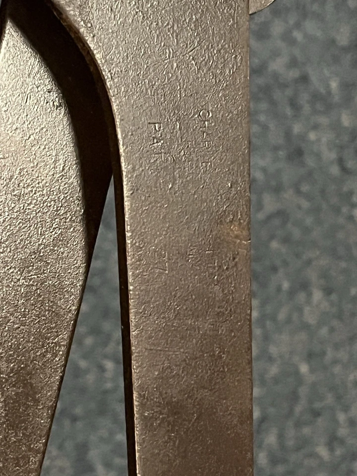 WW1 British Army Barbed Wire Cutters which are marked marked Charles H Pugh Ltd Birmingham and stamped with the British army crow foot.The woodwork is in very good condition with light wear it has had no wood worm or rot which many others have. The teeth have no damage or wear and are still in perfect condition. There is no bending or damage to the wire cutters. Sadly there is no visible date.