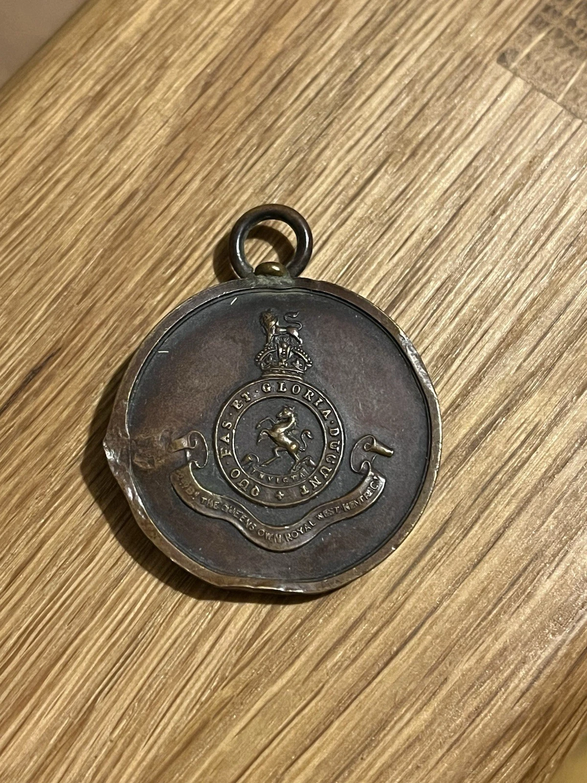 This is an original WW1/WW2 Queen's Own Royal West Kent Regiment Sporting Medal. This example is in worn condition. It has had some severe damage at some point in its life. We have no idea how this has happened but can guess why this example has no engraving. This example has some great details on the front of the Queen's Own Royal West Kent Regiment cap badge. Please see photos for condition.