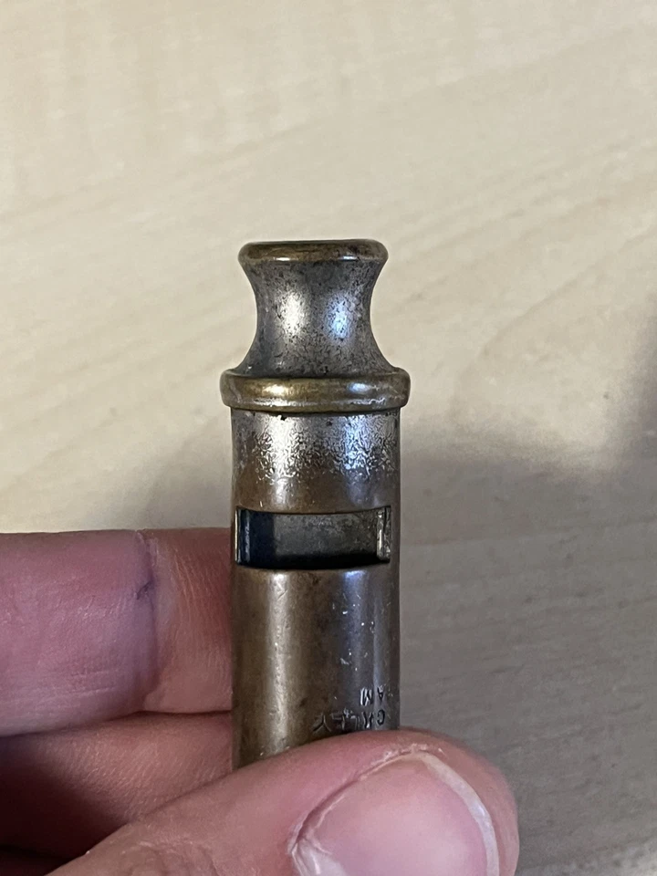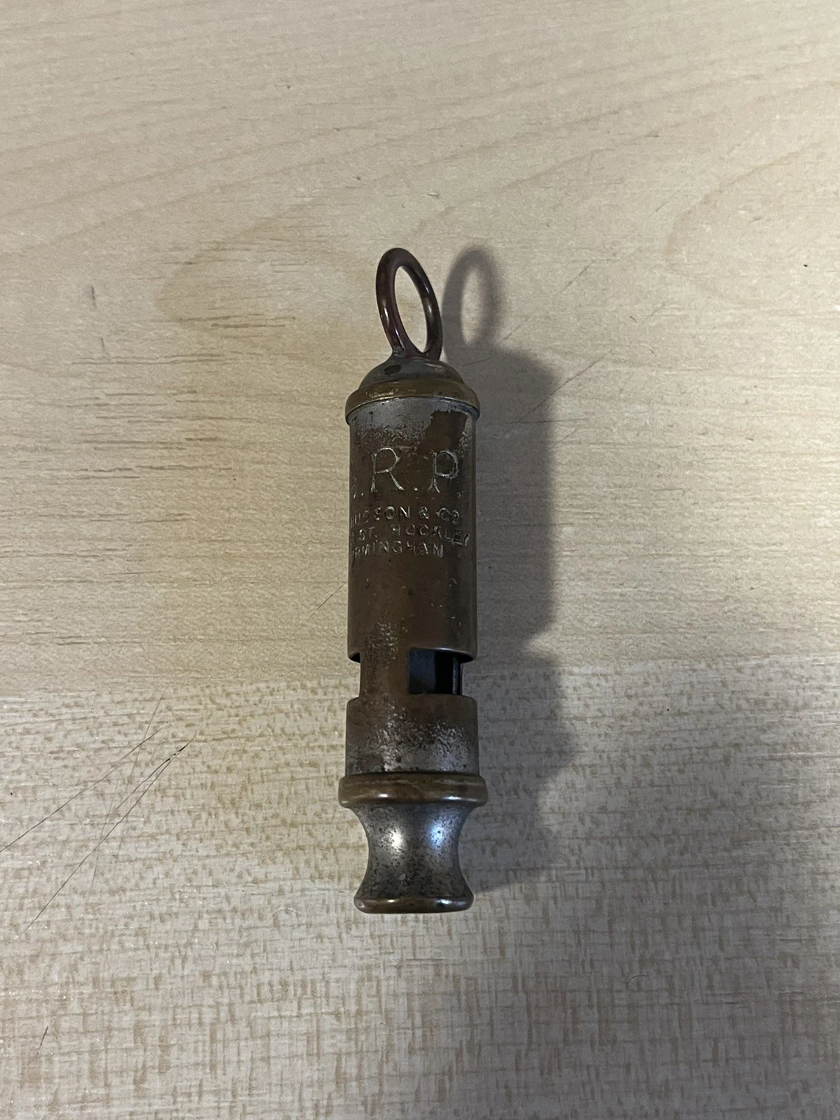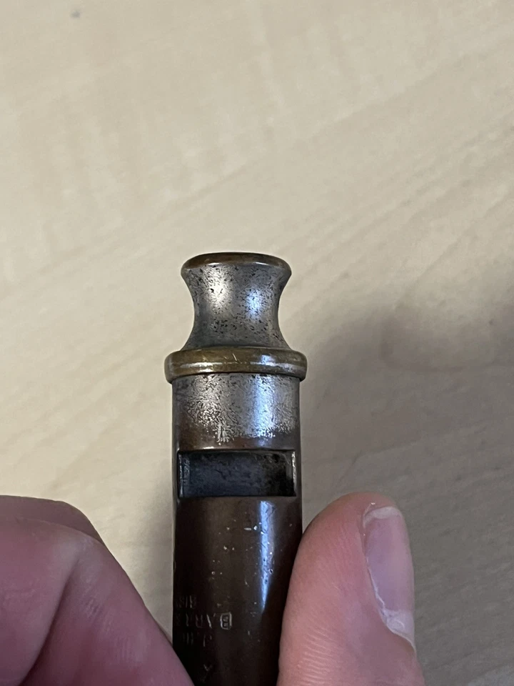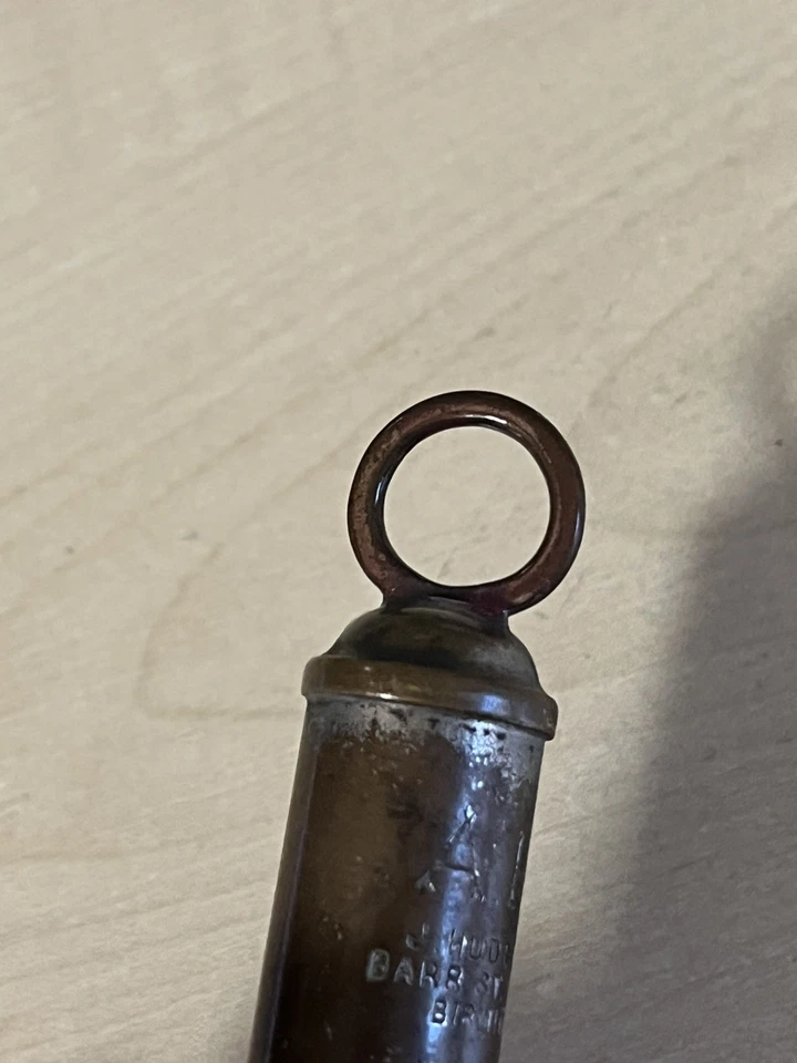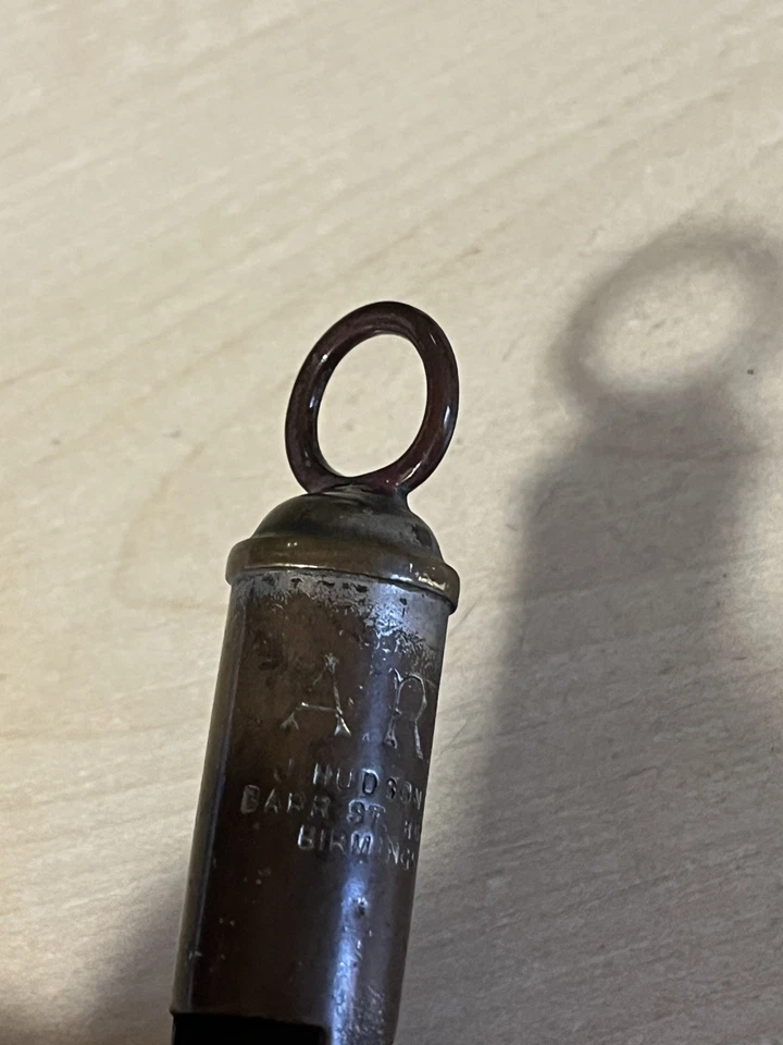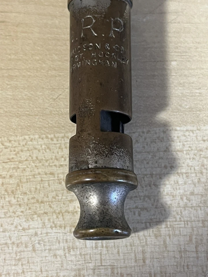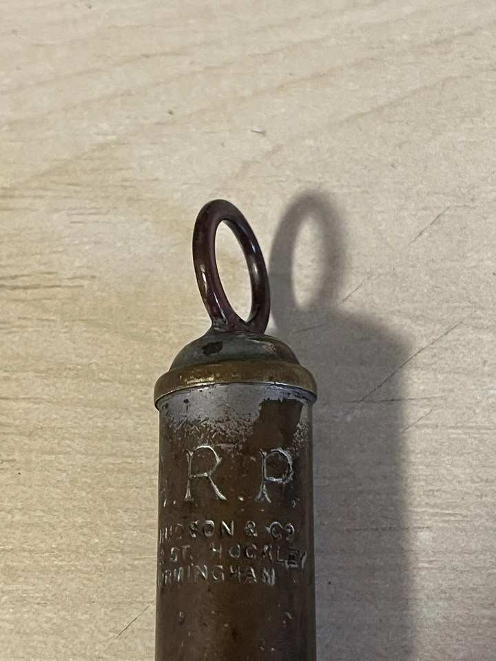 A good original Second World War period 'Air Raid Precautions warden's whistle', nickel plated example impressed 'A.R.P.' with maker's details below 'J.Hudson & Co Barr St. Hockley Birmingham'. Good condition, with signs of wear from the finish being rubbed away and a repair to the top as shown. This example obviously saw a lot of service in its time. These were issued to most of the ARP members, wardens and many other civil defence members during the Second World War.Length approx 82mm.