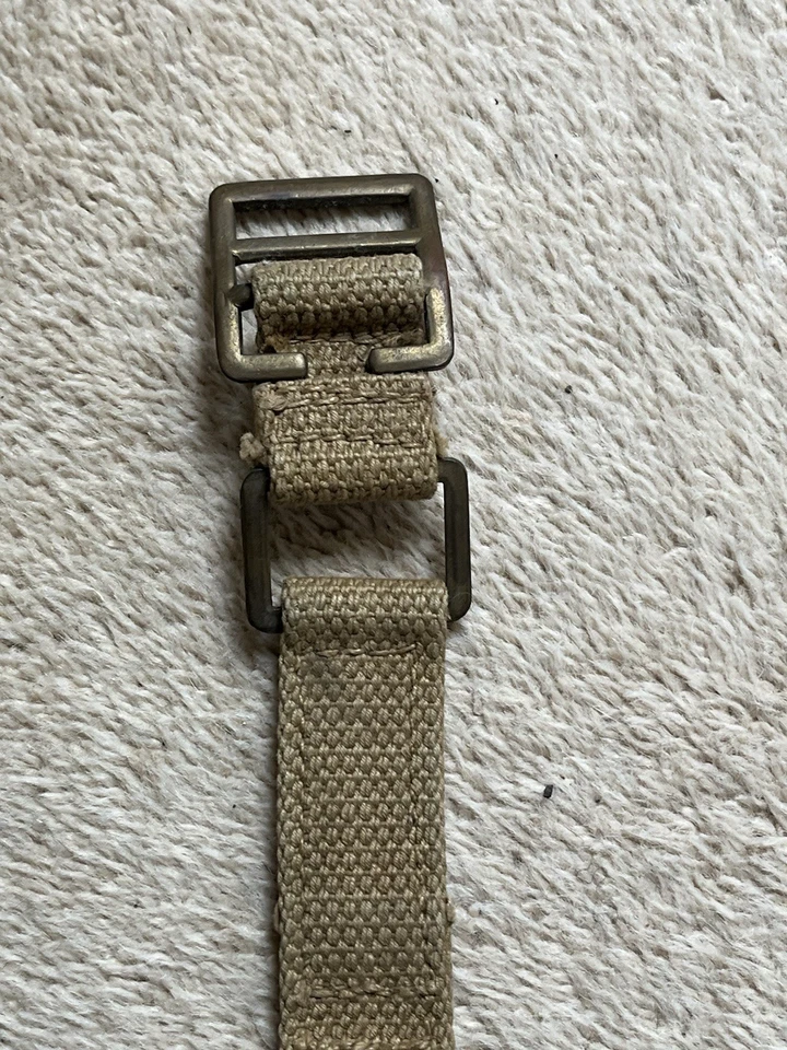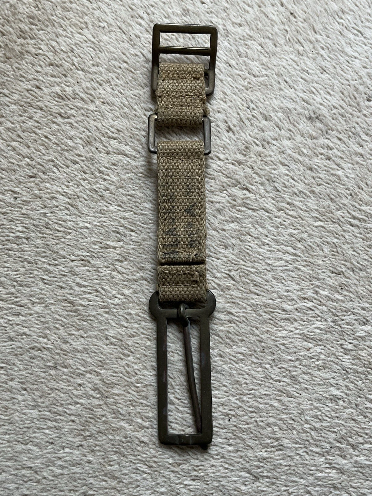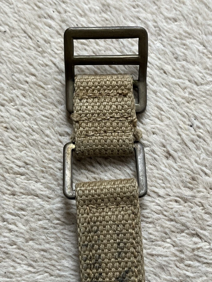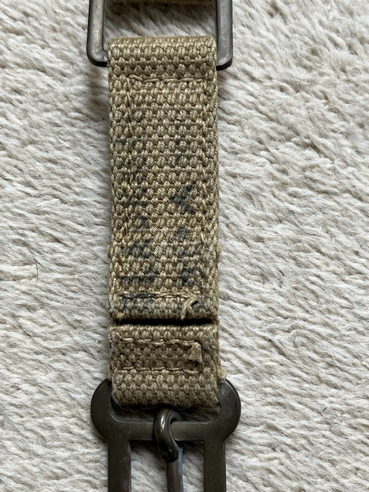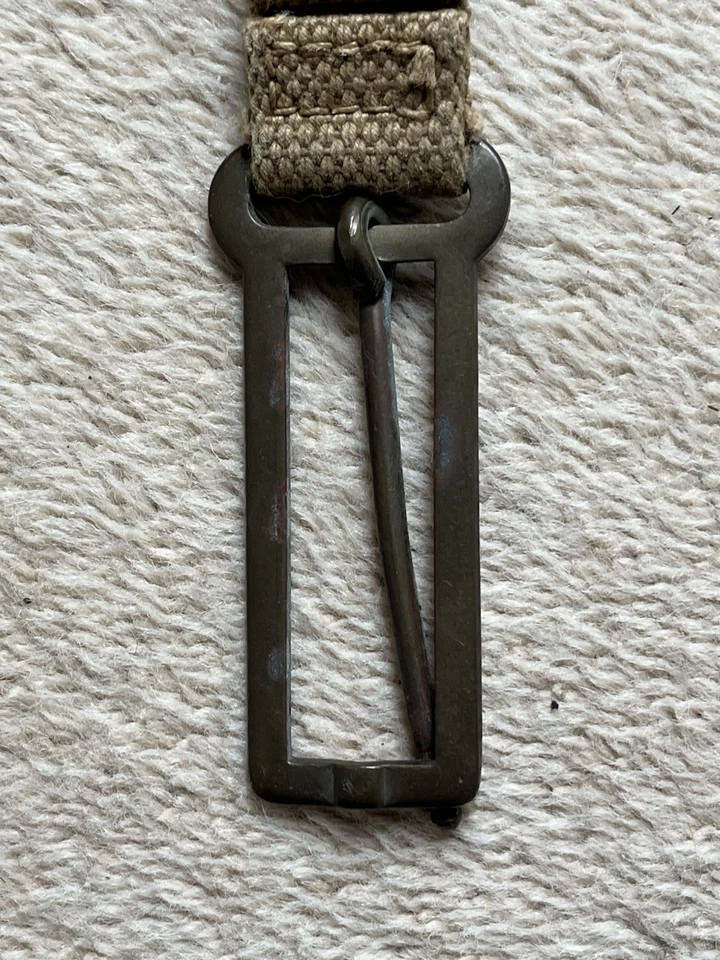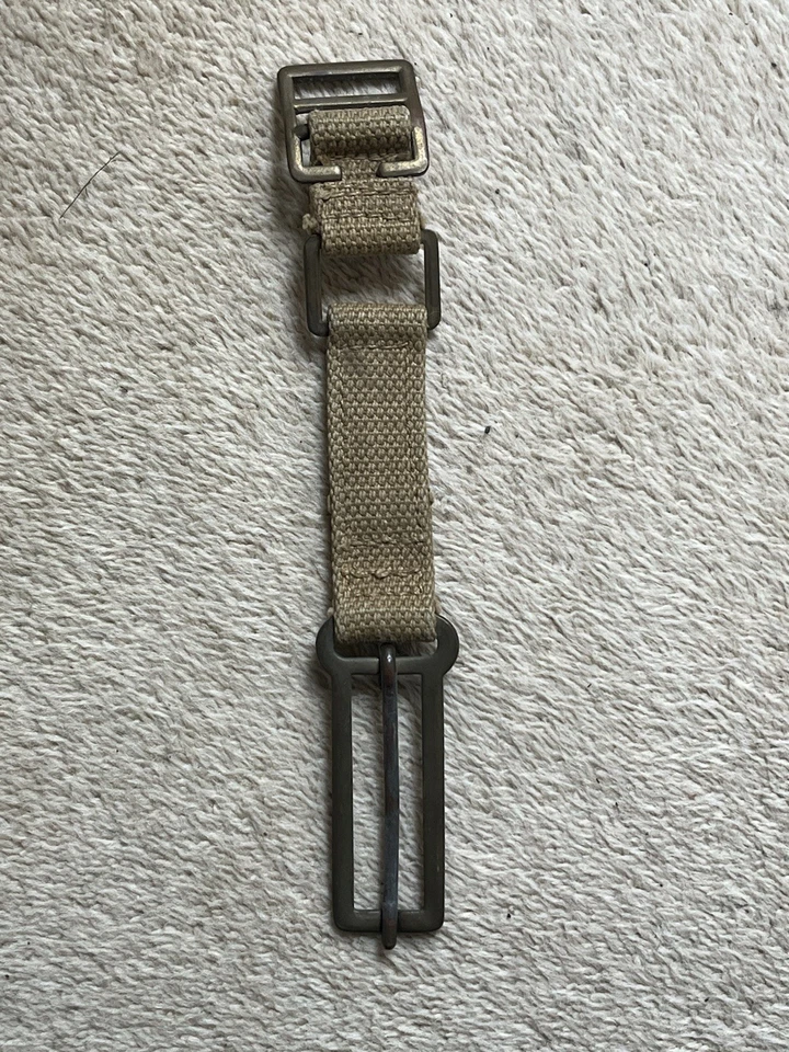 This is an original WW2 British Army Pattern 1937 Webbing Brace strap clips Dated With No Damage. This example is in good condition with no holes or damage. It has the broad arrow mark and a date but we can’t seem to read it very well. Please see photos for condition.This is for just 1.