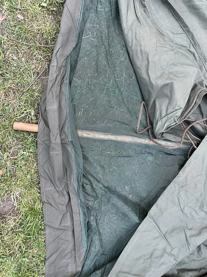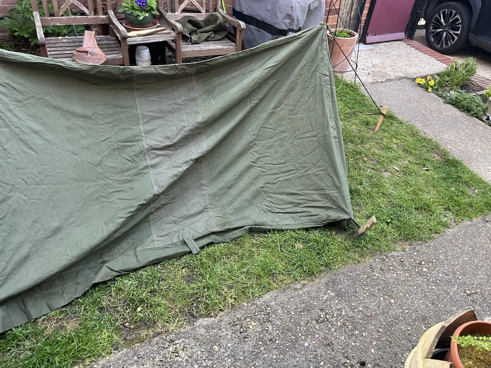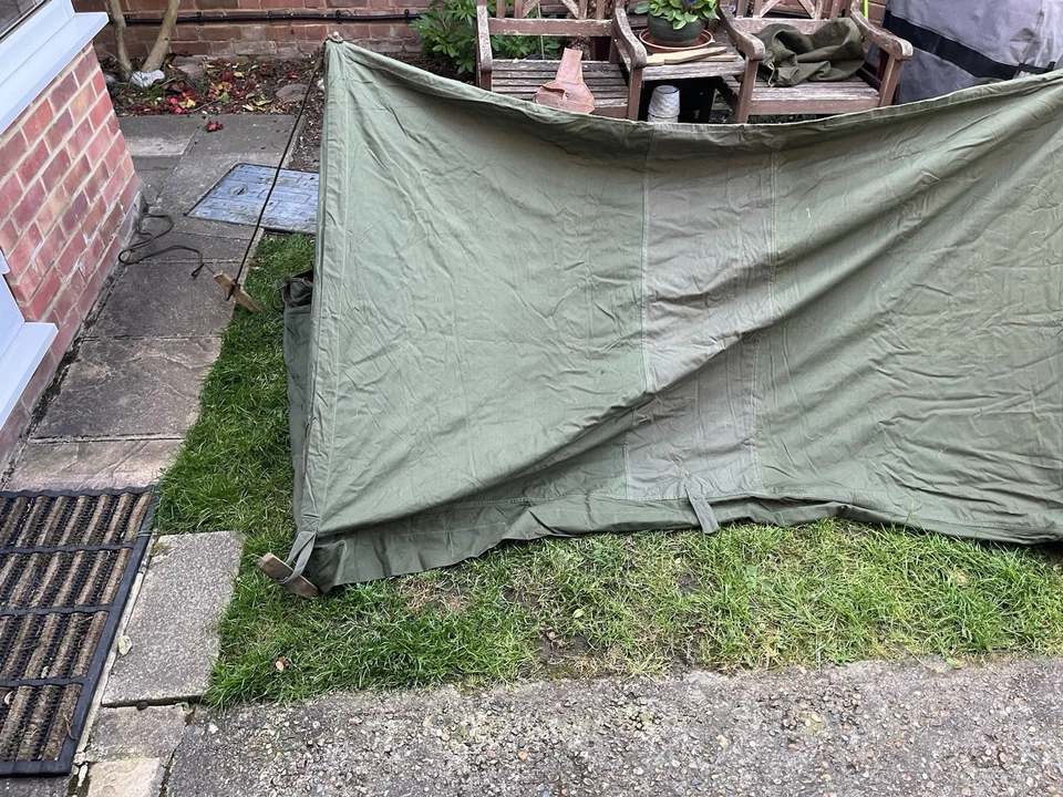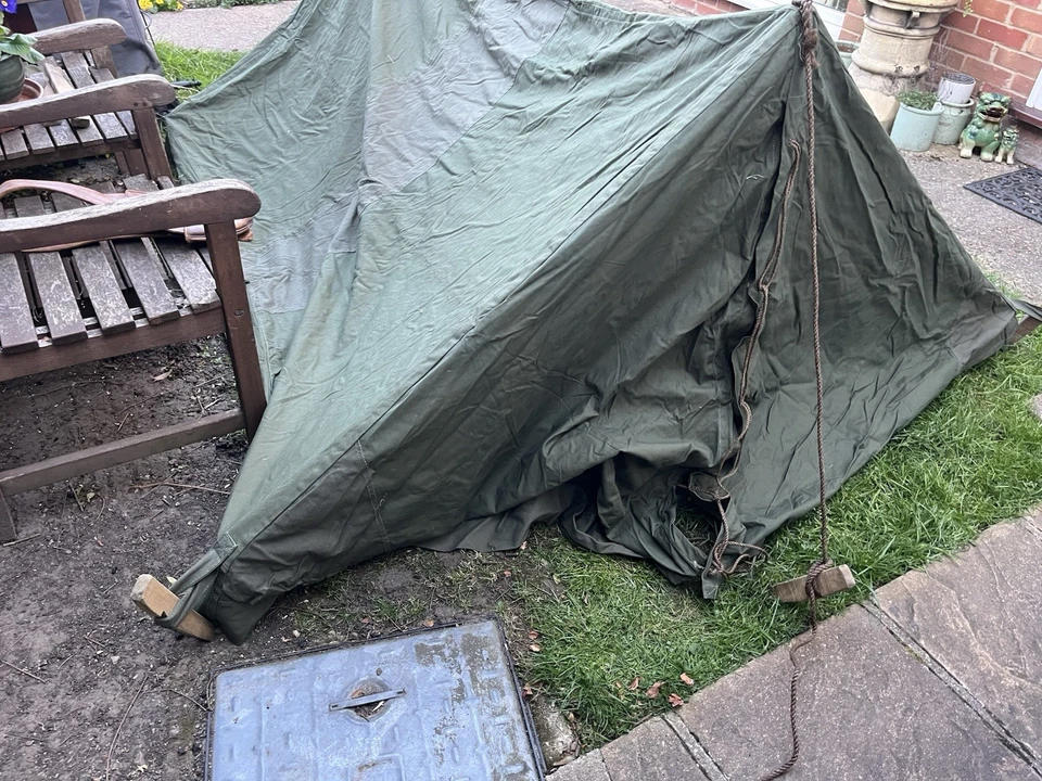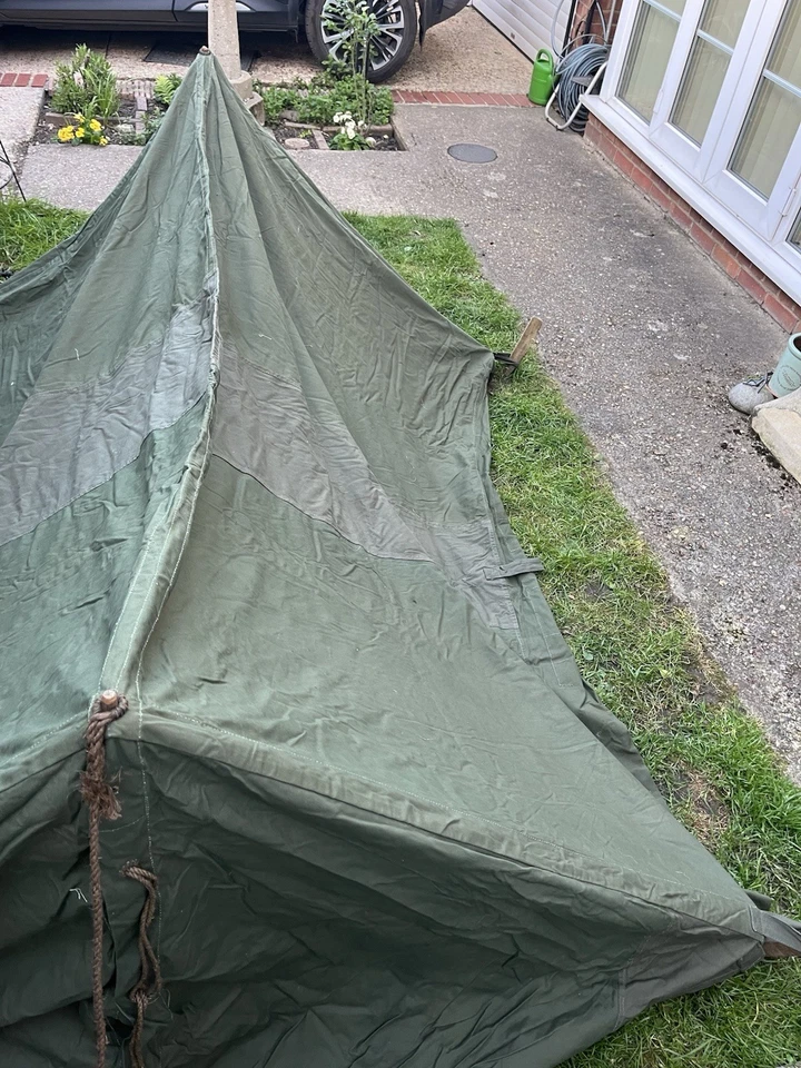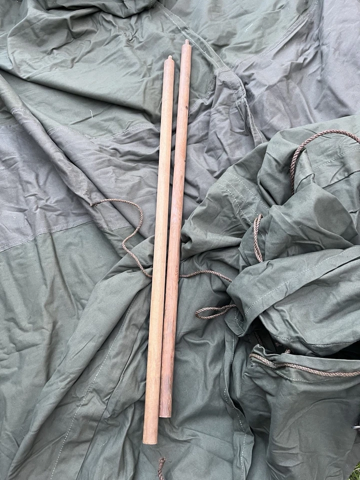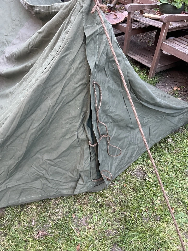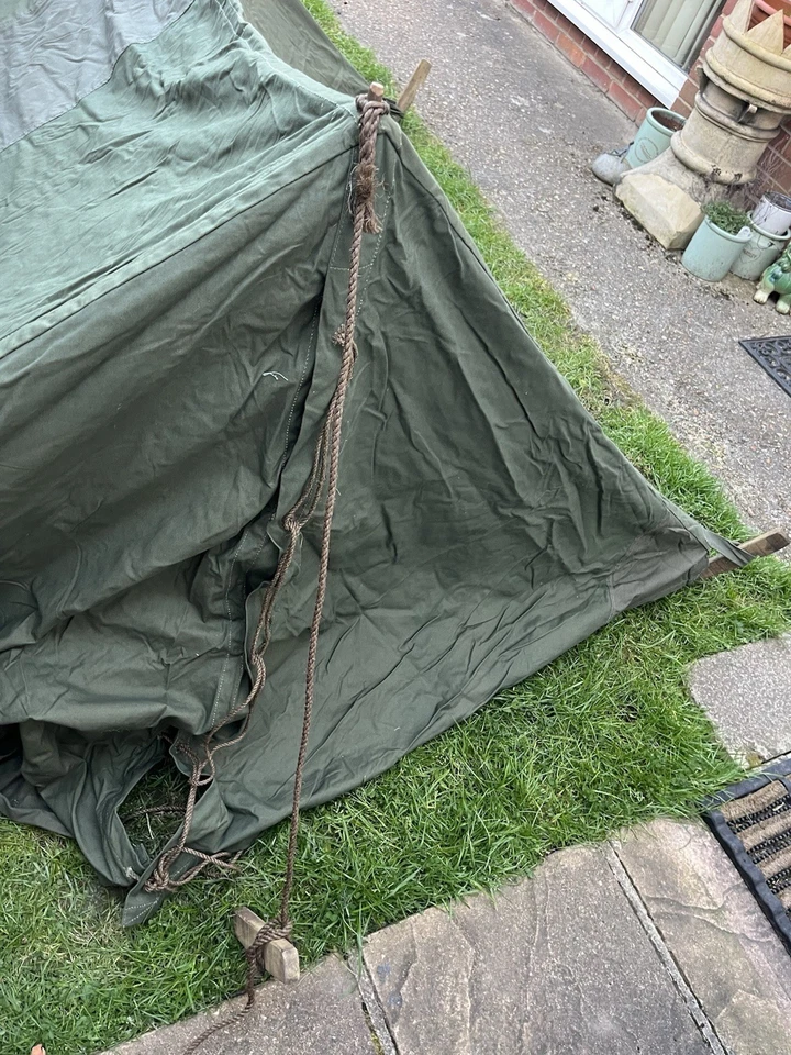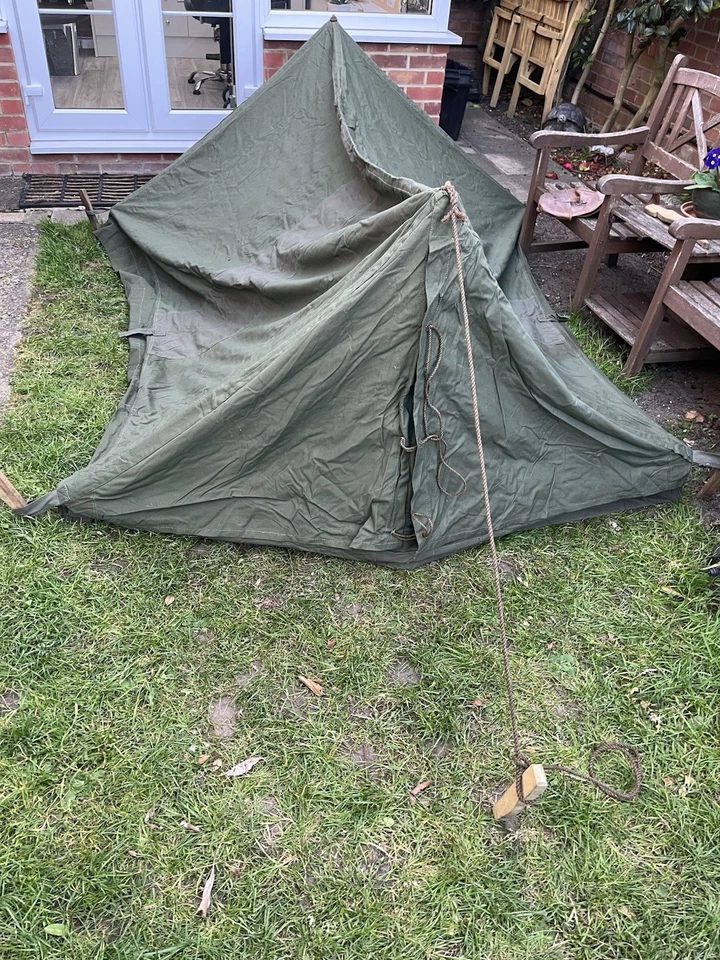This is an original WW2/ Korean War Era 1953 Dated British Army Two Man Pup Tent Complete Set. This example is in almost brand new condition. This example is complete with 2 main poles, 6 wooden pegs and an original wooden mallet. This is a two man British army issued pup tent. It has its original mosquito netting at the front and back of the tent and is made of a thick heavy duty canvas. There is one very small hole as pictured which is only gone through one peice of the canvas. It has all its original rope, fixings and slots for the pegs. The pegs, poles and mallet are all in great condition. It comes complete with its original bag to put all the items in for storage which is dated 1963. Please see photos for condition. This is a very good size tent and could fit two people and their belongings. A great piece of usable history.