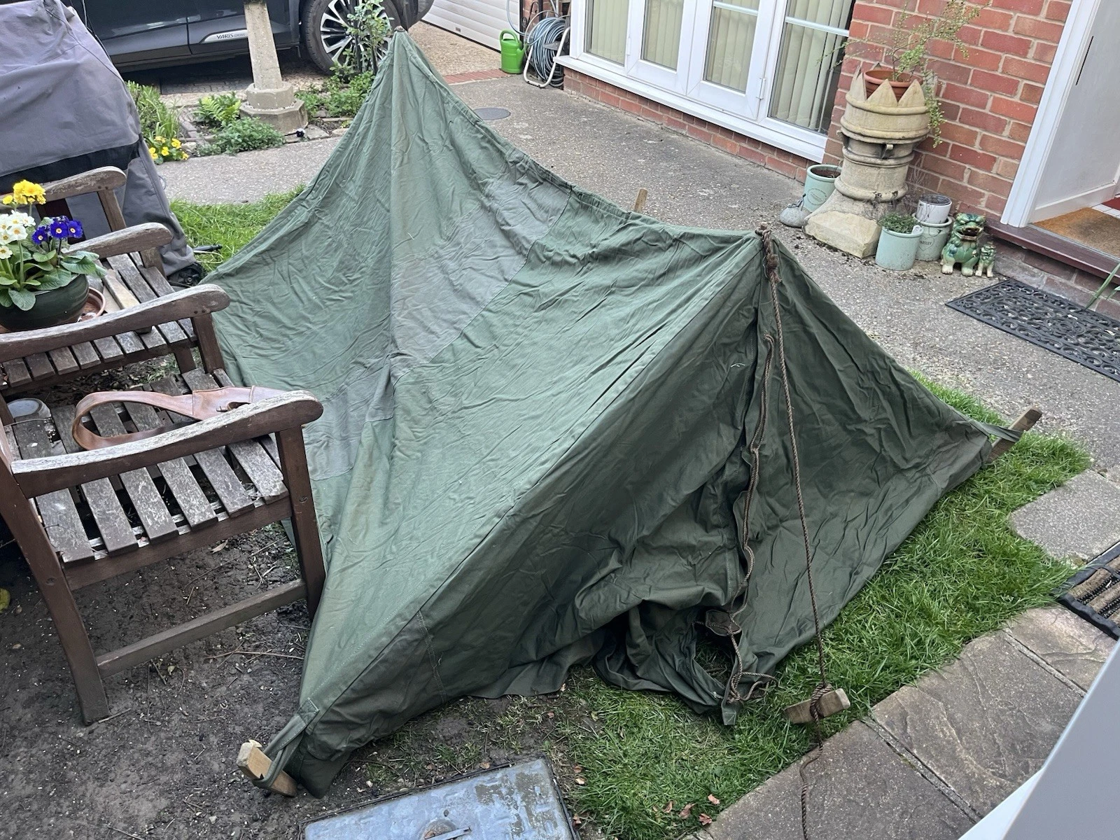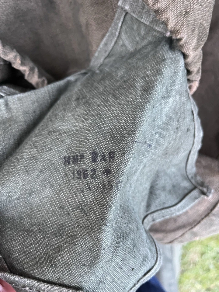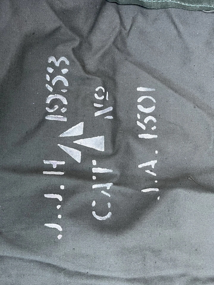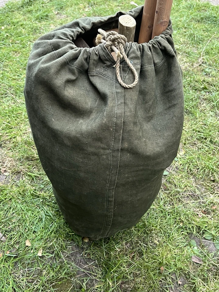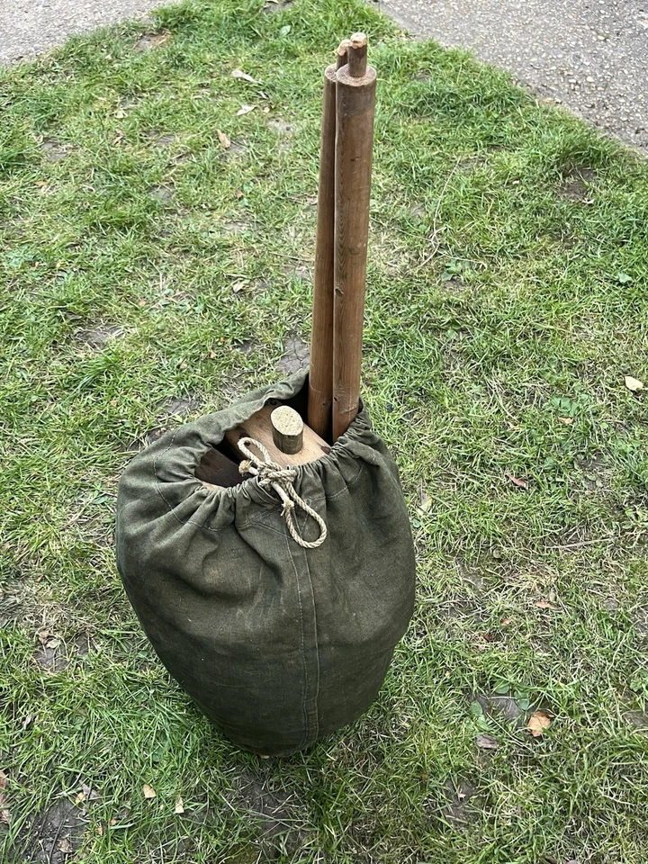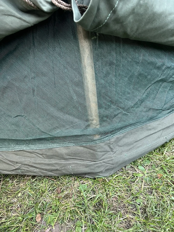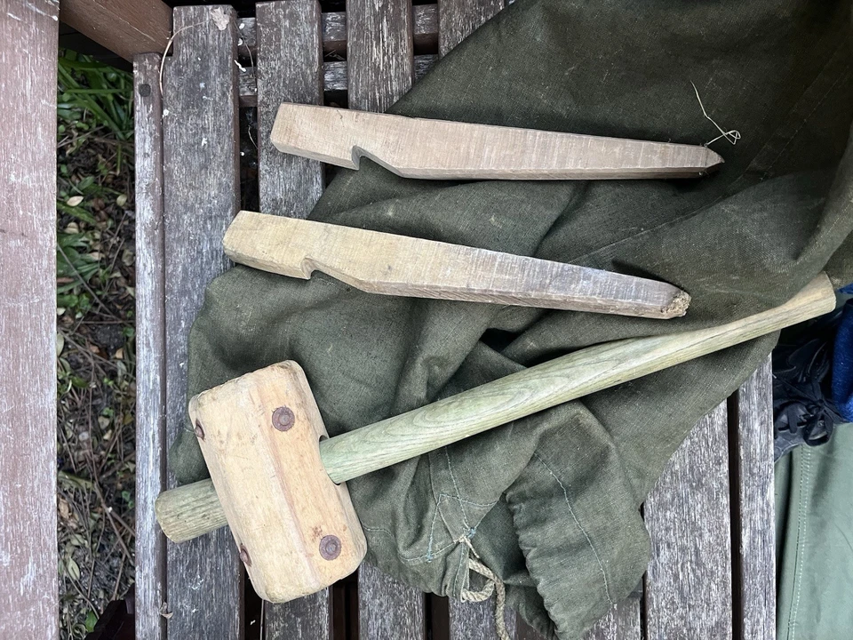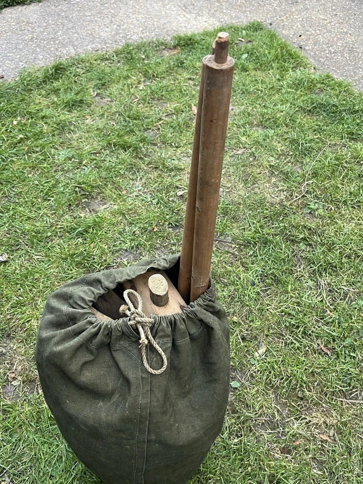 This is an original WW2/ Korean War Era 1953 Dated British Army Two Man Pup Tent Complete Set. This example is in almost brand new condition. This example is complete with 2 main poles, 6 wooden pegs and an original wooden mallet. This is a two man British army issued pup tent. It has its original mosquito netting at the front and back of the tent and is made of a thick heavy duty canvas. There is one very small hole as pictured which is only gone through one peice of the canvas. It has all its original rope, fixings and slots for the pegs. The pegs, poles and mallet are all in great condition. It comes complete with its original bag to put all the items in for storage which is dated 1963. Please see photos for condition. This is a very good size tent and could fit two people and their belongings. A great piece of usable history.