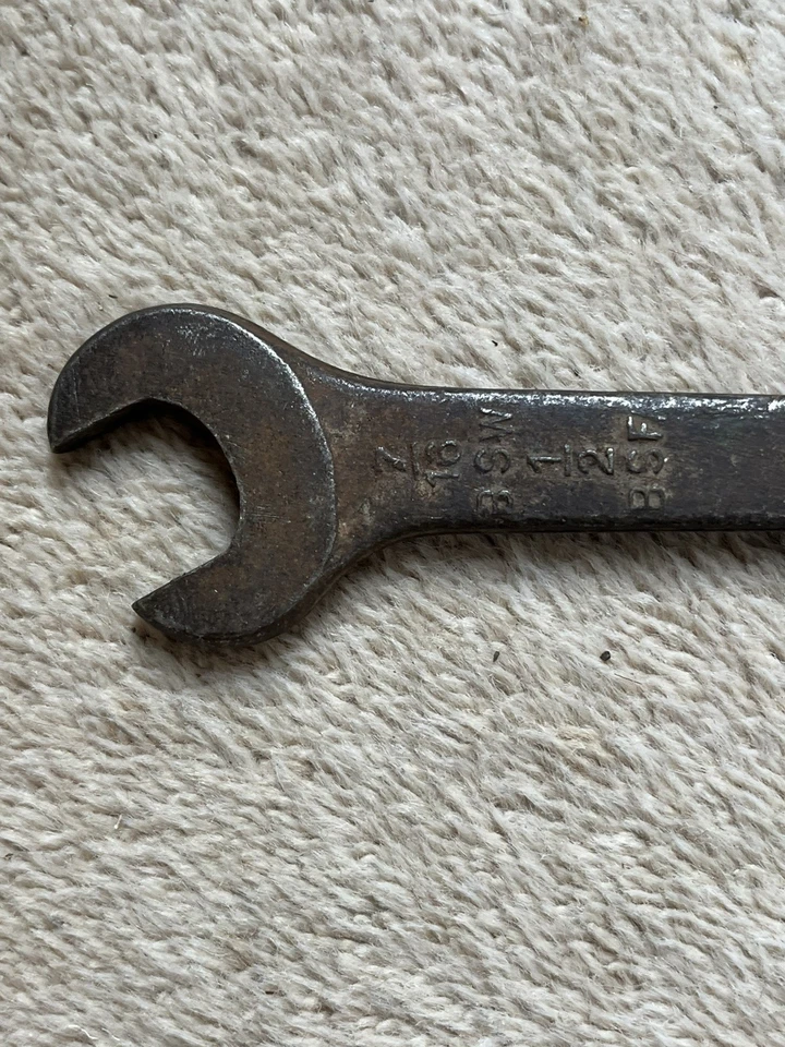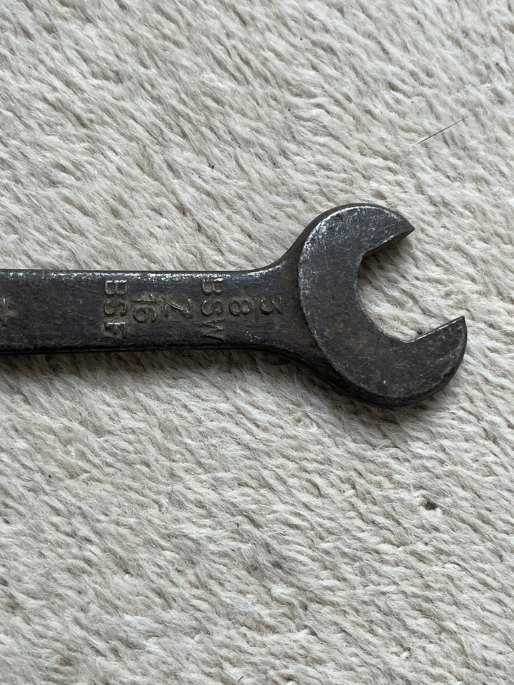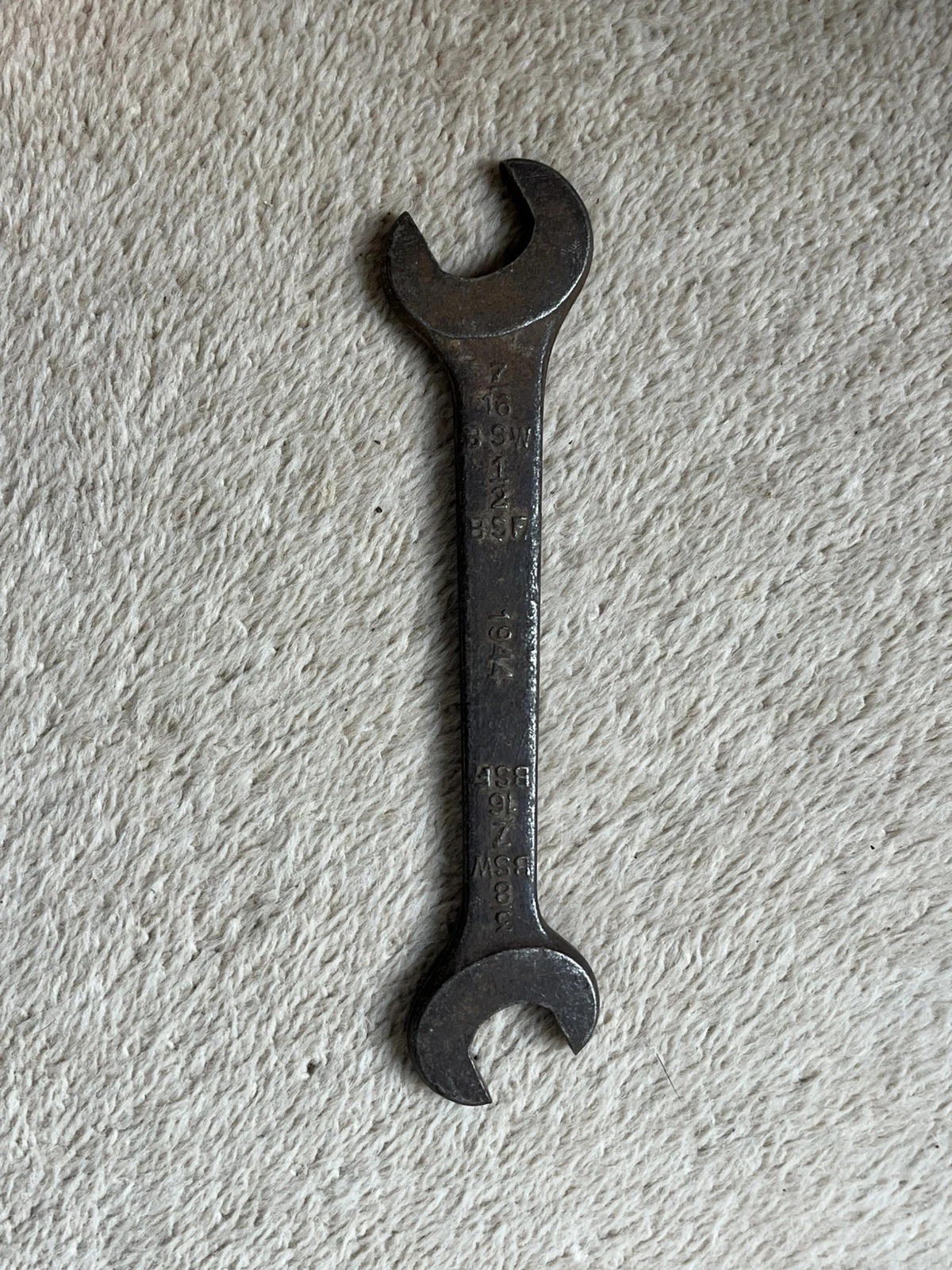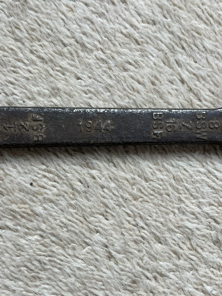 This is a nice WW II British Military Spanner dated 1944 with broad arrow mark, sizes are marked: 3/8 BSW - 7/16 BSF and 1/2 BSW - 9/16 BSF. It has been cleaned, signs of use and wear - see all pictures.